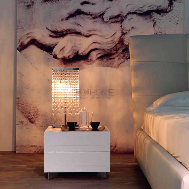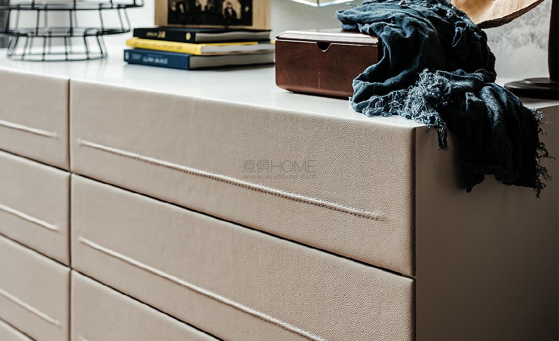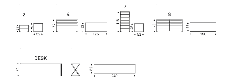 Two drawers nightstand, 4/8 drawers double dresser or seven-drawers high chest with frame in Canaletto walnut (NC), burned oak (RB) or white (OP7) lacquered wood. Polished stainless steel feet. Drawer fronts covered in synthetic leather, or soft leather as per sample card. Desk in matt white lacquered wood (OP7) with lateral support in matt white lacquered steel (OP71). To be laid on the top of Dyno 4 or 8 drawers.