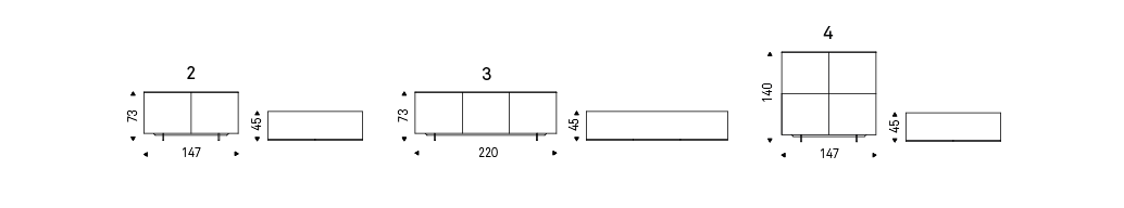 Sideboard in white (OP7), grey (OP30), graphite (OP69), oyster (OP50) or black (OP17) matt lacquered wood. Doors with satin aluminium frame and black or extra clear white, grey, graphite, oyster varnished glass or extra clear frosted glass white or graphite varnished. Top in black or extra clear white, grey, graphite, oyster varnished glass or extra clear frosted glass white or graphite varnished. Clear glass shelves. Optional: internal drawer in each door. In the 4 version, optional internal drawer only in the two lower doors. Polished stainless steel feet or matt white (OP71), black (OP17) or graphite (OP69) varnished.