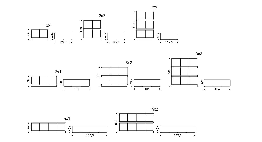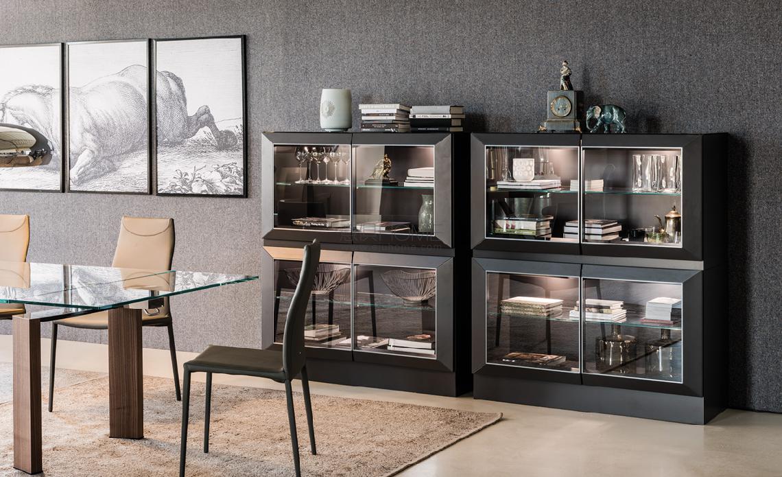 Sideboard, display cabinet in matt white (OP7) or graphite (OP69) lacquered frame. Door profiles lacquered in matt white (OP7) or graphite (OP69) or Canaletto walnut (NC). Doors and internal shelves in extra clear glass. Sideboard h74 and h139 with top in white or graphite painted extra clear glass. Optional: internal led light kit.