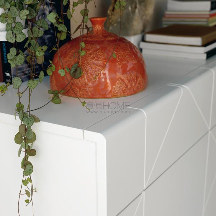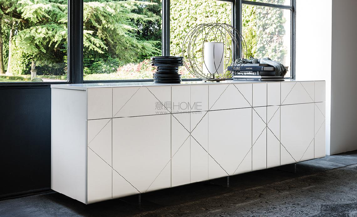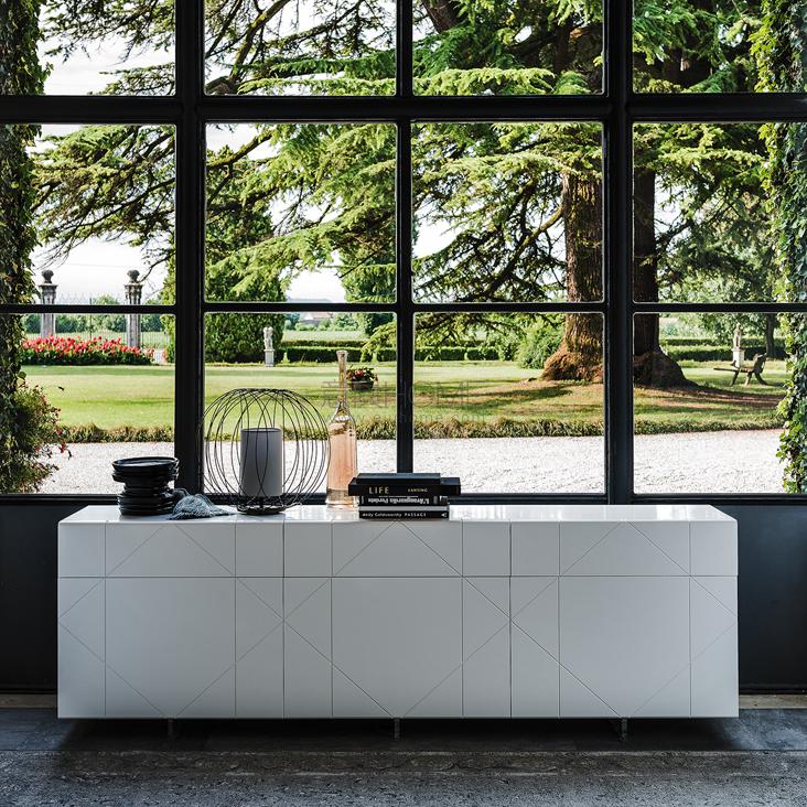 Sideboard with matt white (OP7) or graphite (OP69) lacquered doors and drawers. Feet in transparent methacrylate. Internal shelves in clear glass on demand.
