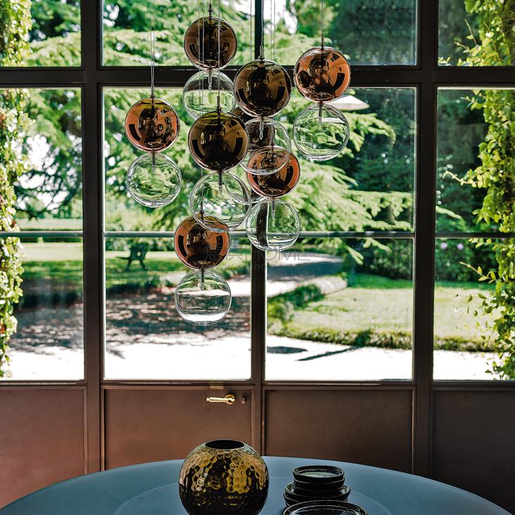 Ceiling lamp with lampshade made of 2 borosilicate glass spheres. Lower sphere in transparent glass and upper sphere in transparent glass or painted chrome, copper, bronze. Ceiling fixing in chromed steel. S1: single plate. S5: rectangular ceiling plate for 5 lampshades. S8R: round ceiling plate for 8 lampshades. S8oval: oval ceiling plate for 8 lampshades. Bulb included.