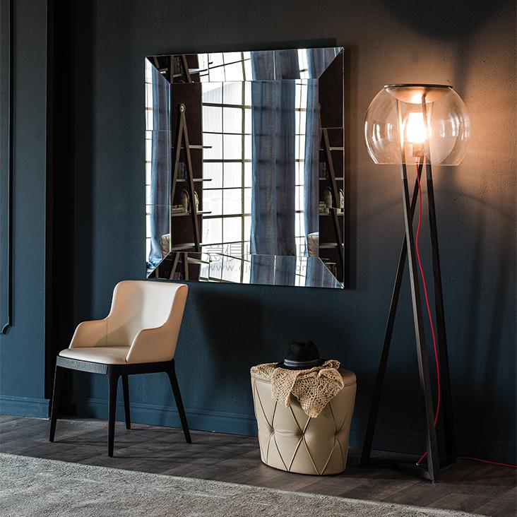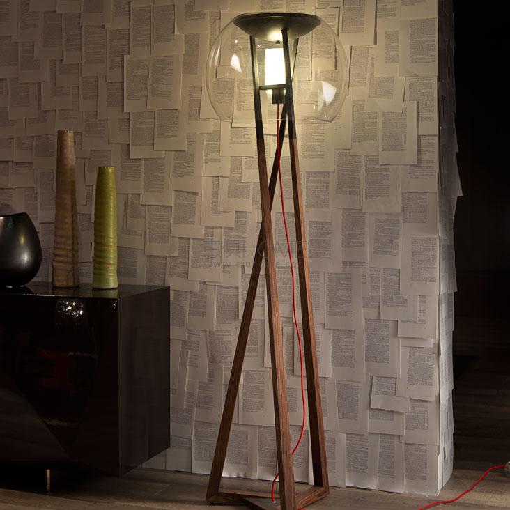 Floor lamp with frame in Canaletto walnut (NC) or burned oak (RB) and matt graphite (OP69) steel. Lampshade in clear glass. Red cable. Bubbles and irregularities of the lampshade are peculiarities of blown glass. Bulb not included.