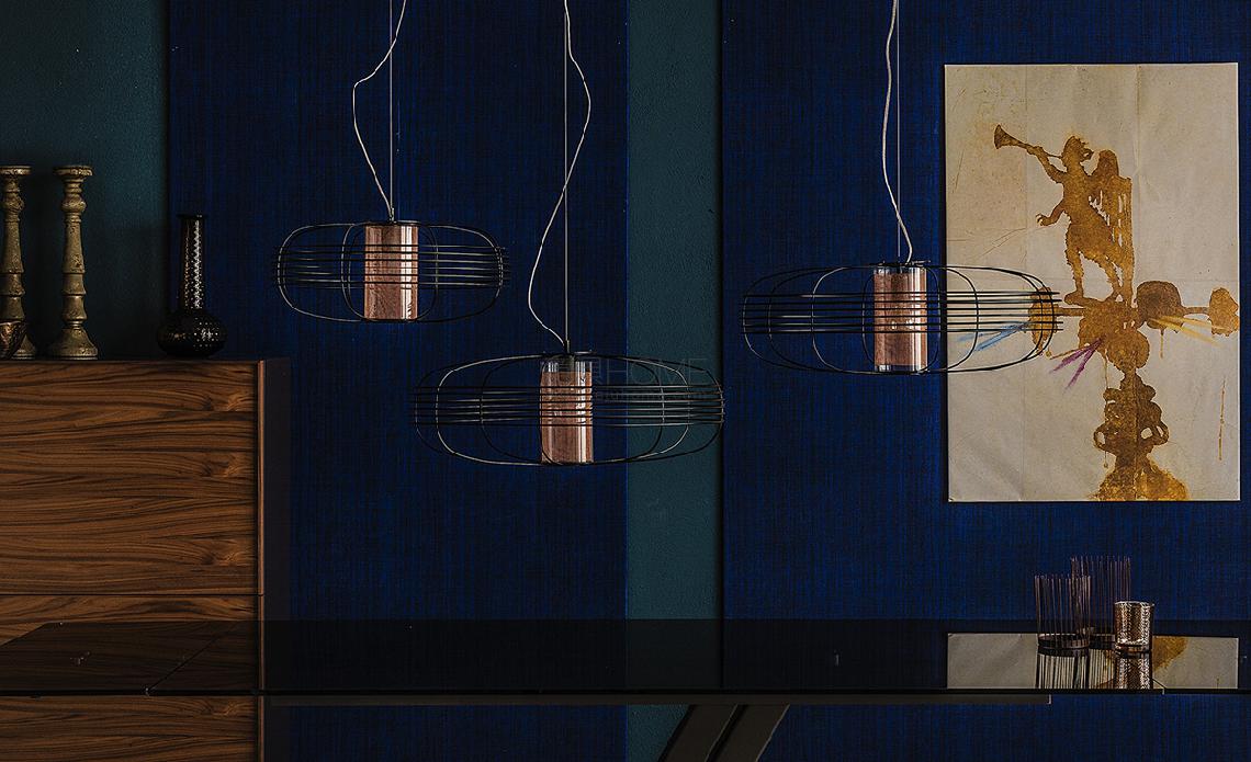 Ceiling lamp with matt black (OP17) painted steel or Nickel frame. Lampshade in borosilicate glass and copper net. Bulb not included.