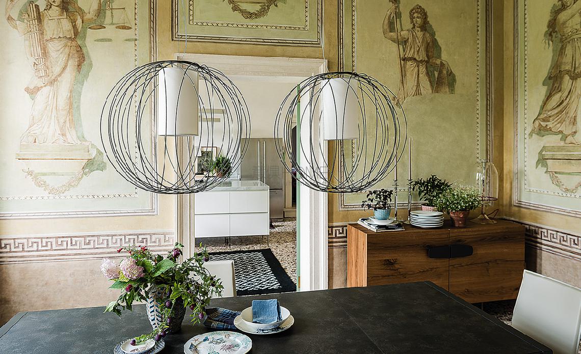Ceiling or floor lamp with steel frame in painted matt black (OP17) or Nickel. Lampshade in ivory fabric. Bulb not included.