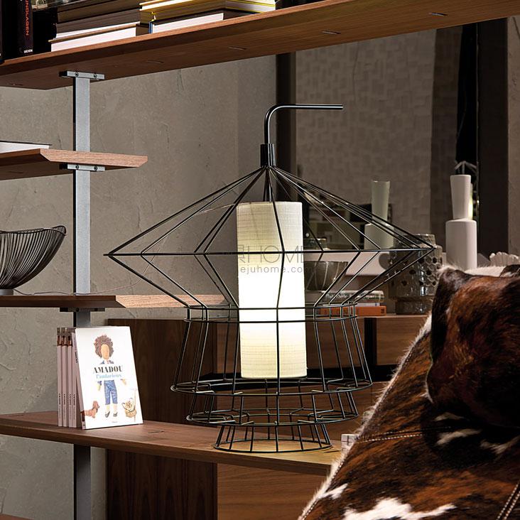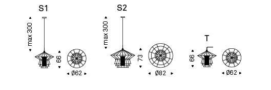 Ceiling or floor lamp with steel frame in matt black painted (OP17) or Nickel. Ivory, brown or black covering fabric. Bulb not included.