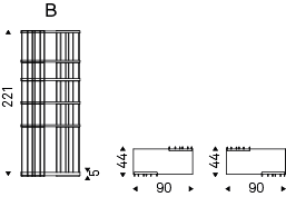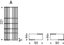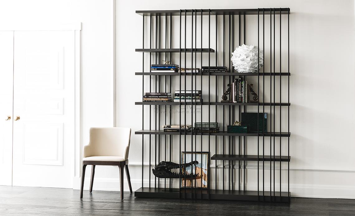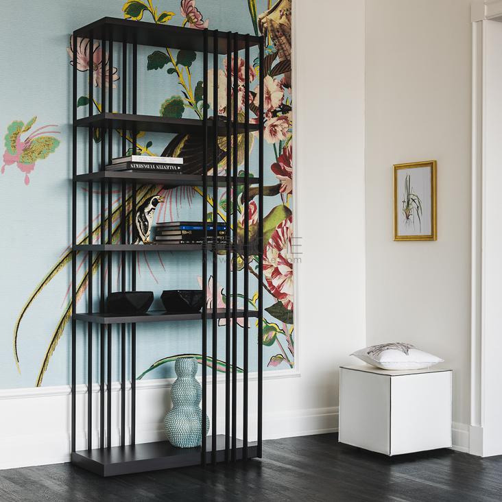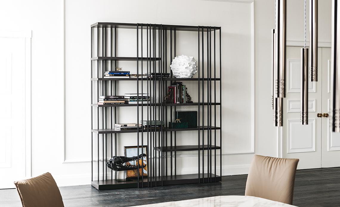 Modular bookcase with frame in titanium (GFM11), graphite (GFM69), white (GFM71) or black (GFM73) embossed lacquered steel. Shelves in Canaletto walnut (NC) or burned oak (RB) or embossed white (GF71) or graphite (GF69) painted wood. The frame can be assembled right or left (as one wants).