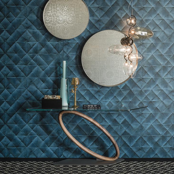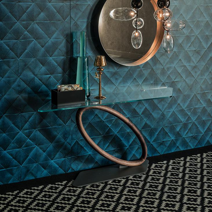 Console with base in graphite embossed lacquered steel (GFM69) and leg in Canaletto walnut (NC). Top in clear glass, extra clear glass or Canaletto walnut (NC). Max capacity 10 kg spread load. Wall anchorage is necessary. The different manufacturing of wooden leg and top causes a different Canaletto Walnut tonality between them.