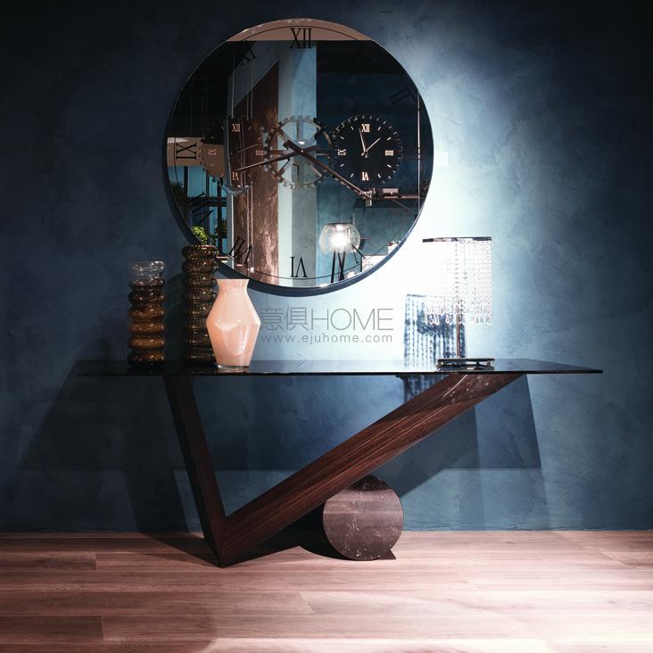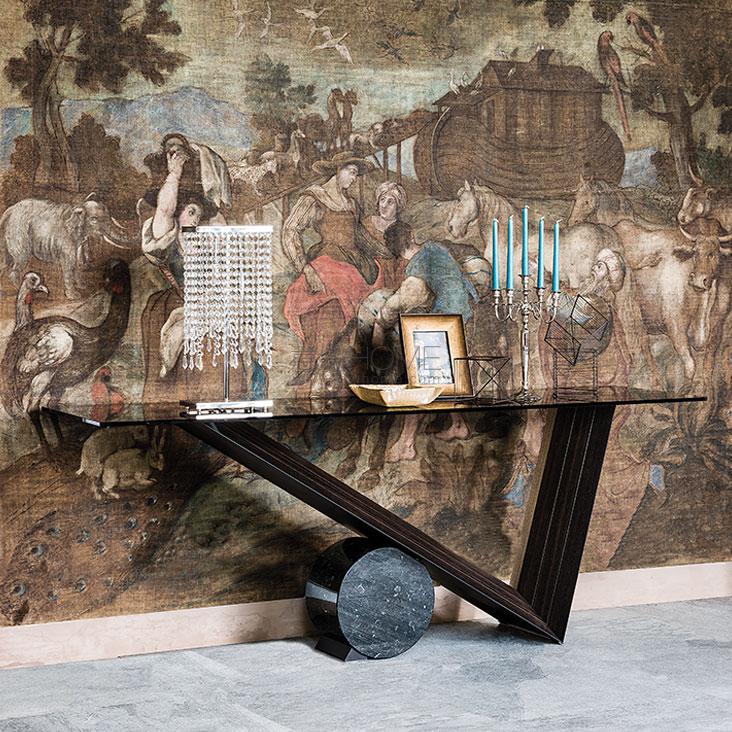 Console in Canaletto walnut (NC) or burned oak (RB) and cylinder in Travertine (TN), black Marquina (NM) or white Carrara (BC) marble. Top in 12mm clear or smoked glass, laid on the base.