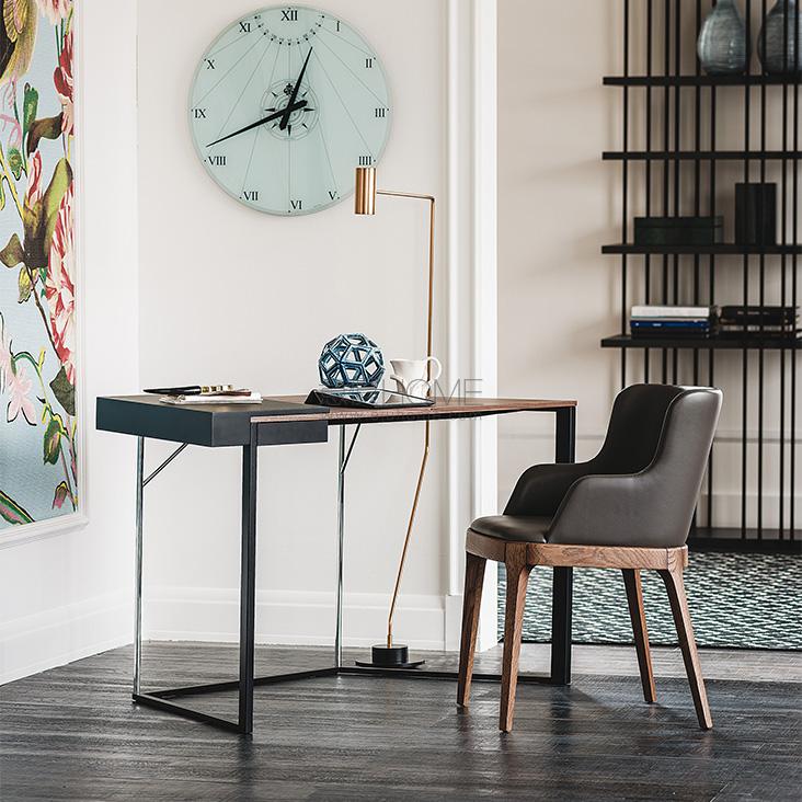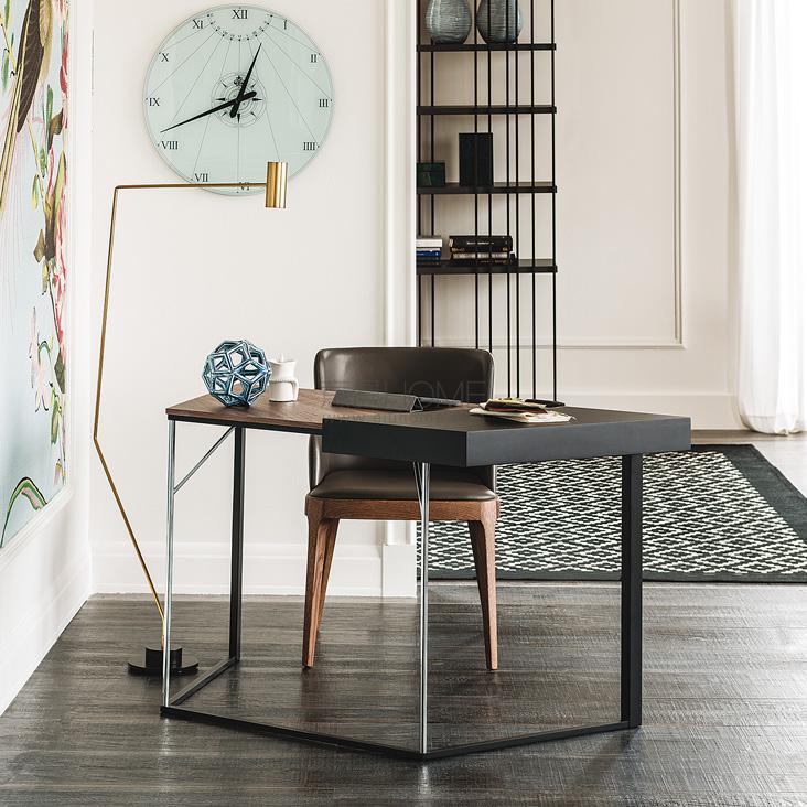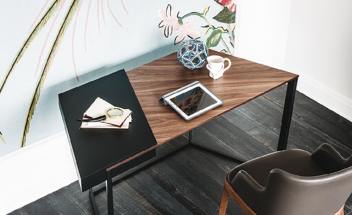 Desk with drawer with frame in graphite (GFM69) or black (GFM73) embossed lacquered steel and chromed stainless steel. Top in lacquered graphite (GF69) or black (GF73) embossed MDF and Canaletto walnut (NC) or burned oak (RB).