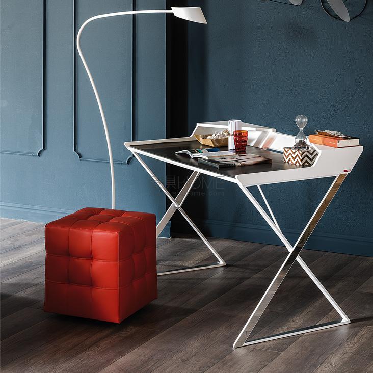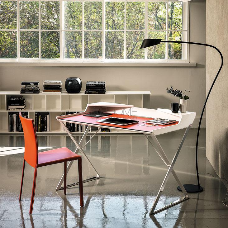 Desk with matt graphite (OP69) or white (OP71) painted frame and profile in polished stainless steel. Top in lacquered white (GF71) or graphite (GF69) embossed MDF. Leather pad as per sample card.