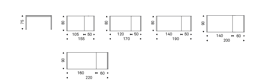 Extendible table with base in graphite (GFM69) or white (GFM71) embossed lacquered steel, with or without profiles in polished stainless steel. Top and extensions in matt white (LM01) post-formed or grey oxide (LM06) laminated wood.