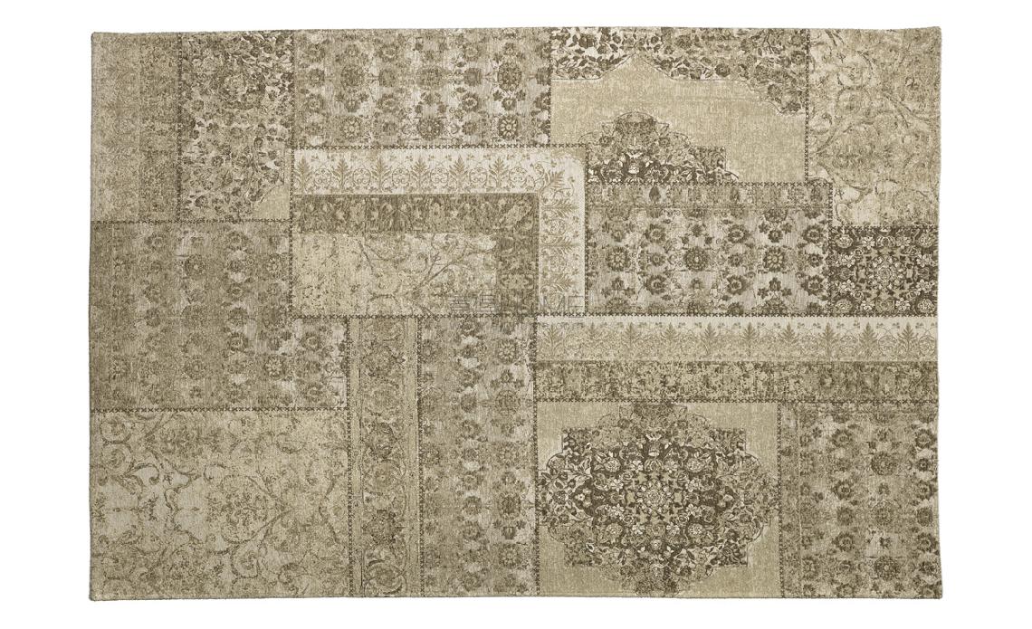 Rug made in cotton and chenille with relief and with a faded and used appearance.