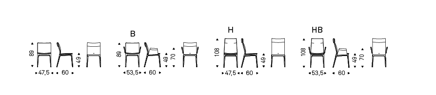 Chair with or without arms. Frame in natural beech (F1), Canaletto walnut stained beech (FNC), wenghè stained beech (FW), matt white (OP7) or black (OP17) lacquered beech. Cover in fabric, synthetic nubuck, micro nubuck, synthetic leather or soft leather as per sample card. The cover is not removable.