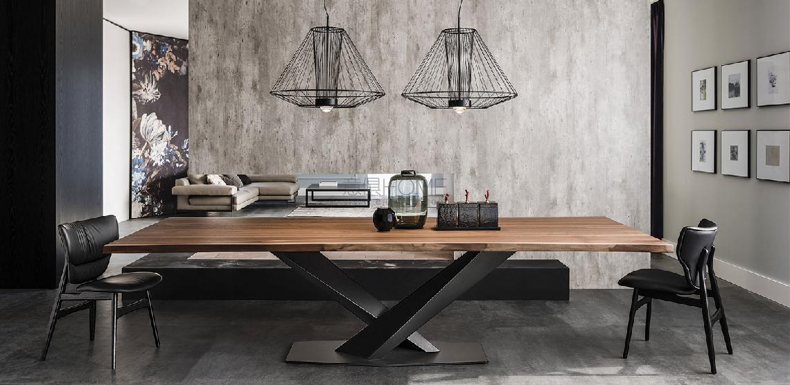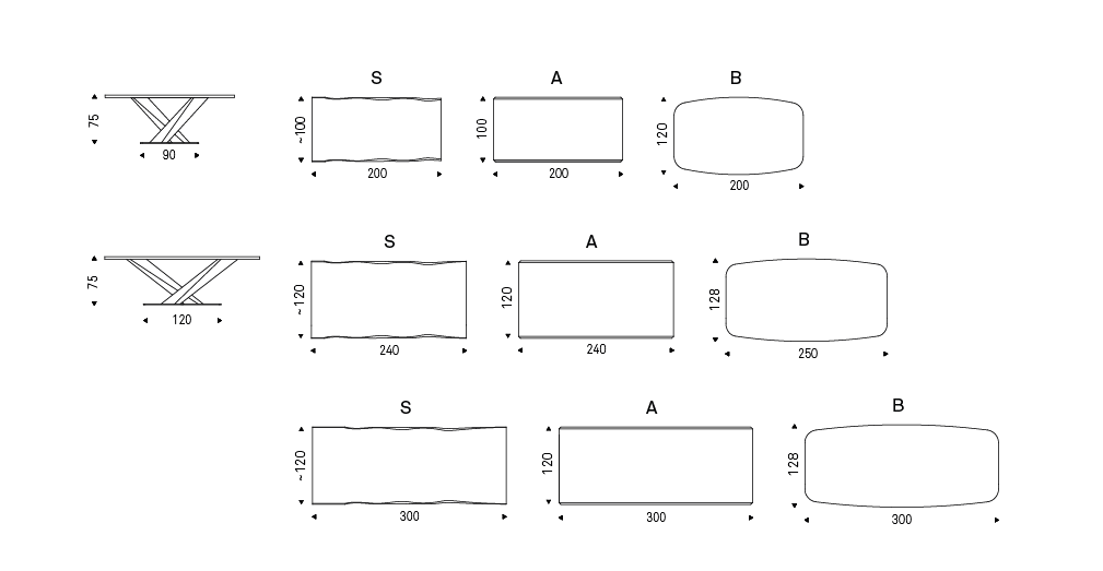 Table with base in titanium (GFM11), bronze (GFM18), graphite (GFM69) or black (GFM73) embossed lacquered steel. Top S version 4cm thick with irregular solid wood edges in Canaletto walnut (NC), burned oak (RB) or natural oak (RN). Version "A": top with angled edges in Canaletto walnut (NC), Heritage oak (HR) or natural oak (RN). Wooden top 4cm on 200x100 version and 5cm on 240x120 and 300x120 versions. Vesion "B": barrel top with angled edges in Canaletto walnut (NC) or burned oak (RB).