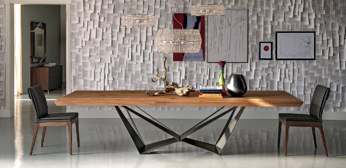 Table with base in titanium (GFM11), bronze (GFM18), graphite (GFM69), white (GFM71) or black (GFM73) embossed lacquered steel, Brushed Bronze or Brushed Grey lacquered steel. A version: top with angled edges in Canaletto walnut (NC), Heritage oak (HR) or natural oak (RN). 4cm thick wooden top on160x160 and 200x100 versions and 5cm on 240x120 and 300x120 versions. Special sizes for top on demand. Version "S": top with irregular solid wood edges in Canaletto walnut (NC), burned oak (RB) or natural oak (RN), 4cm thickness. Vesion "B": barrel top with angled edges in Canaletto walnut (NC) or burned oak (RB). Version "C": top in Canaletto walnut (NC) with Brushed Grey lacquered and rounded lower profile or Elm open pore matt black (OLM73) with Brushed Bronze lacquered and rounded lower profile.