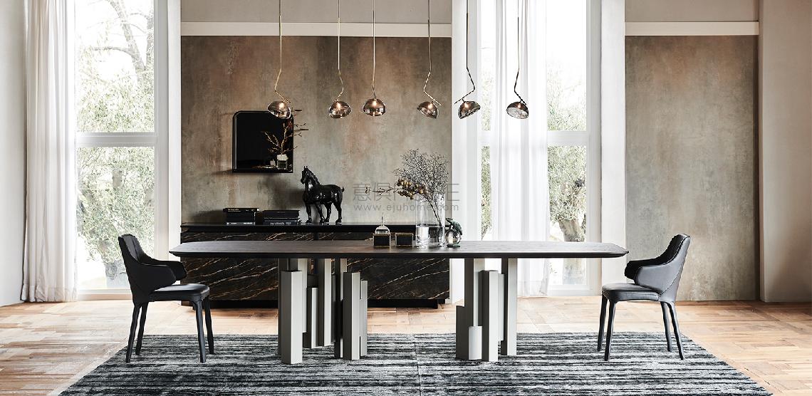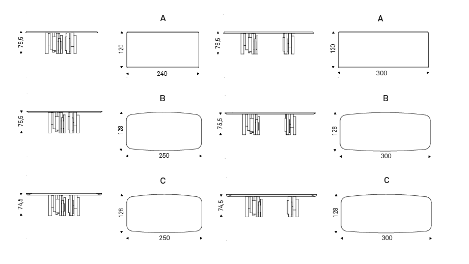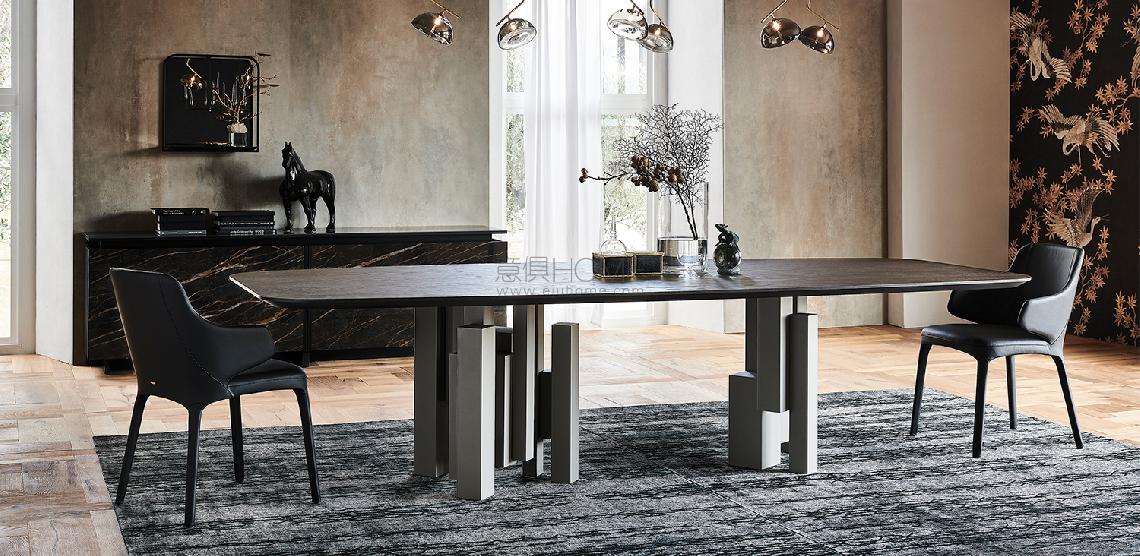 Table with base in titanium (GFM11), graphite (GFM69) or black (GFM73) embossed lacquered steel. Version "A": top with angled edges in Canaletto walnut (NC), Heritage oak (HR) or natural oak (RN). Vesion "B": barrel top with angled edges in Canaletto walnut (NC) or burned oak (RB). Version "C": top in Canaletto walnut (NC) with black lacquered and rounded lower profile or Elm open pore matt black (OLM73) with Brushed Bronze lacquered and rounded lower profile. Vesion "B": barrel top with angled edges in Canaletto walnut (NC) or burned oak (RB). Version "C": top in Canaletto walnut (NC) with Brushed Grey lacquered and rounded lower profile or Elm open pore matt black (OLM73) with Brushed Bronze lacquered and rounded lower profile.