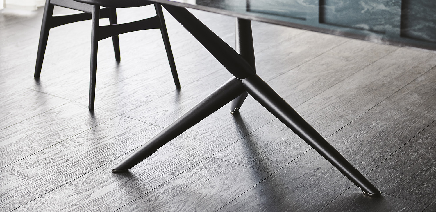 Table with titanium (GFM11), bronze (GFM18), graphite (GFM69) or black (GFM73) embossed lacquered steel base. Feet in black chrome (06). Top 12mm thick in extra clear bevelled glass with artistic decorative printing in two different colours (CY01, CY02).