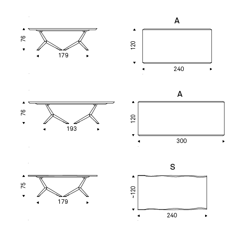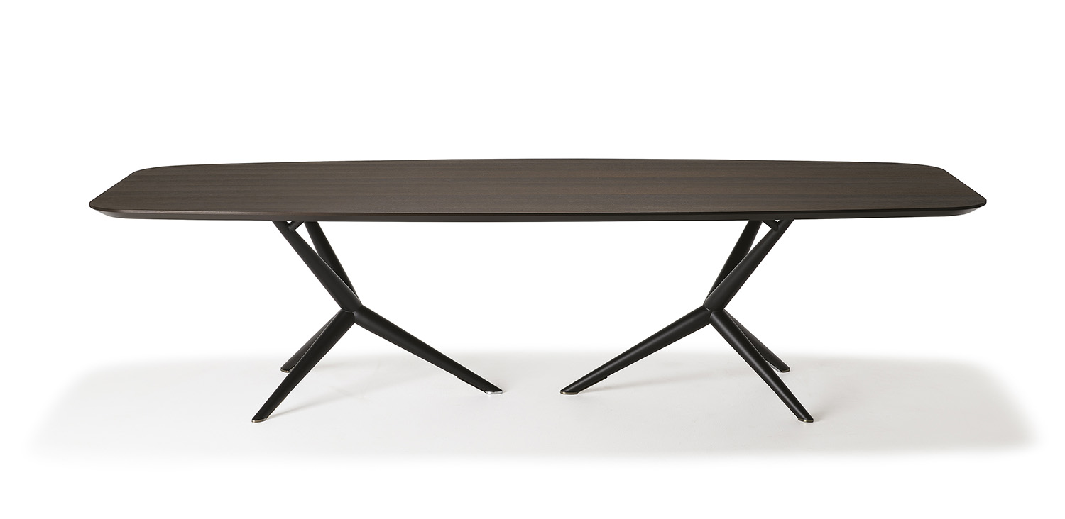 Table with titanium (GFM11), bronze (GFM18), graphite (GFM69) or black (GFM73) embossed lacquered steel base. Feet in black chrome (06). Version "A": top with angled edges in Canaletto walnut (NC), Heritage oak (HR) or natural oak (RN). Version "S": top with irregular solid wood edges in Canaletto walnut (NC), burned oak (RB) or natural oak (RN). Version "B": barrel top with angled edges in Canaletto walnut (NC) or burned oak (RB).