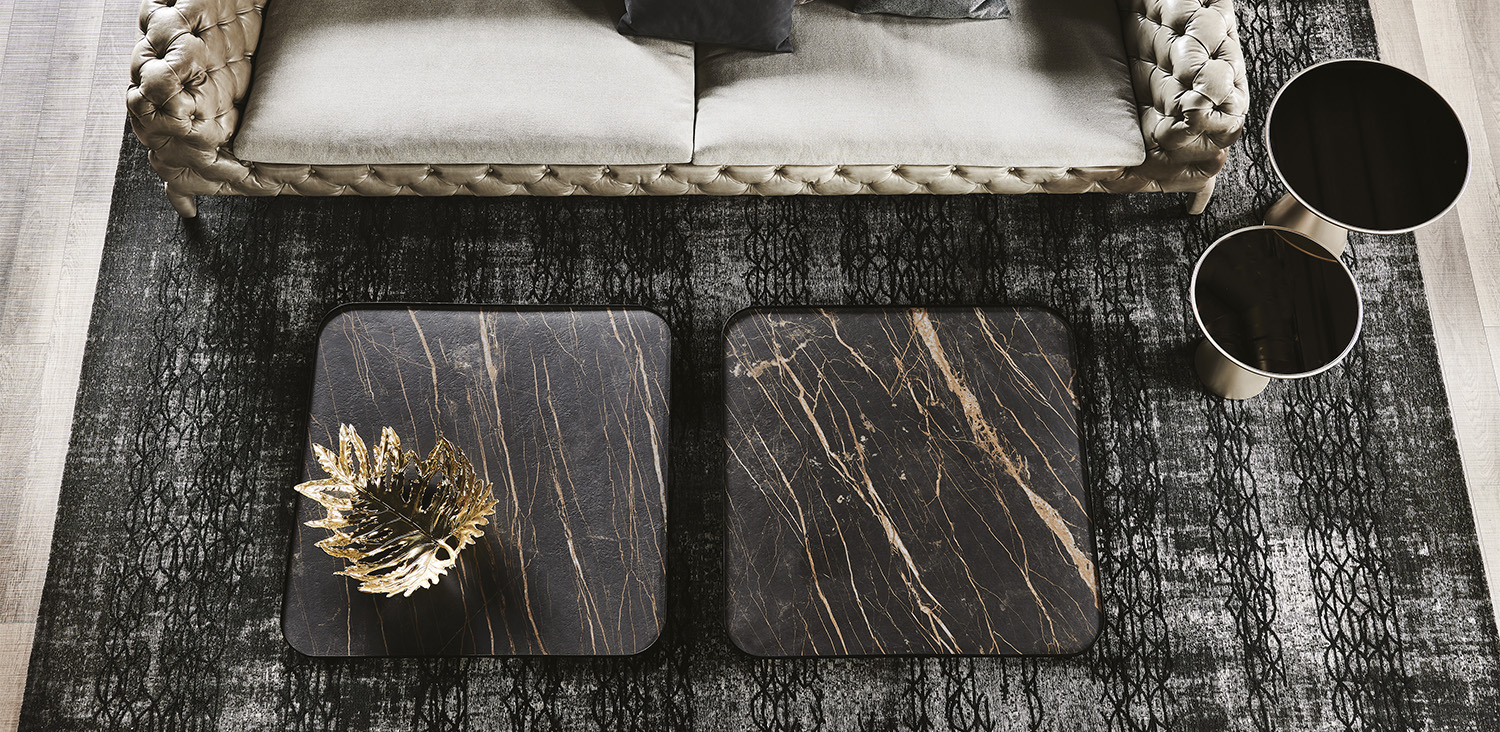 Coffee table with frame in embossed titanium (GFM11) or black (GFM73) lacquered steel, or with base in Bronze and Brushed Bronze top frame. Marmi Calacatta (KM01), Alabastro (KM02), Ardesia (KM04), matt Golden Calacatta (KM05), glossy Golden Calacatta (KM06), matt Portoro (KM07), glossy Portoro (KM08), glossy Sahara Noir (KM09), Emperador (KM10), Makalu (KM11), Breccia (KM12), Arenal (KM13) or Zefiro (KZ20) ceramic top.