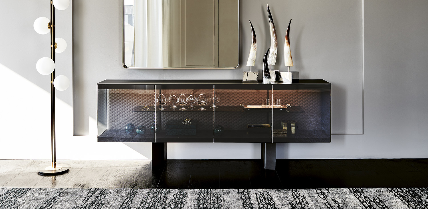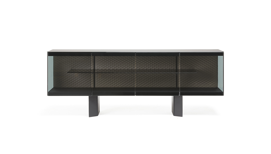 Sideboard with frame and feet in black embossed lacquered steel (GFM73), doors and sides in fumé glass with stripes in black painted glass. Top and bottom in black painted frosted glass, internal back covered and quilted in soft leather or synthetic leather as per sample card. Internal shelf in fumé glass. LED light.