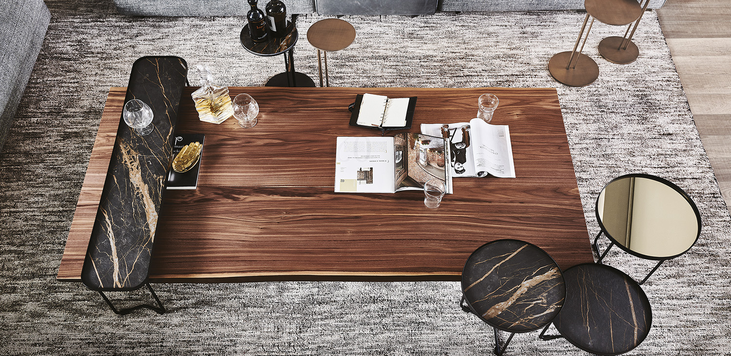 Coffee table with frame in graphite (GFM69) embossed lacquered steel and top in Canaletto walnut (NC), burned oak (RB) or natural oak (RN) with irregular solid wood edges.