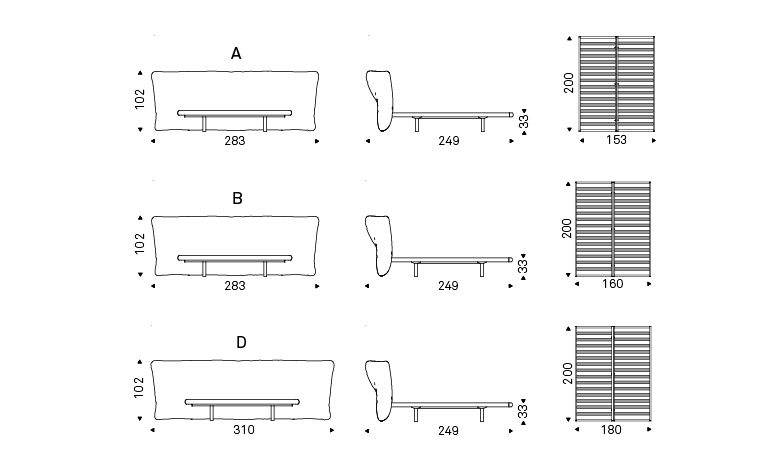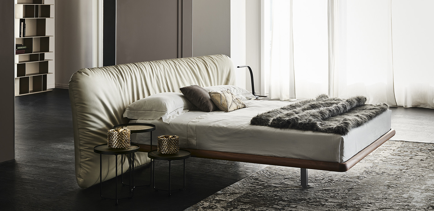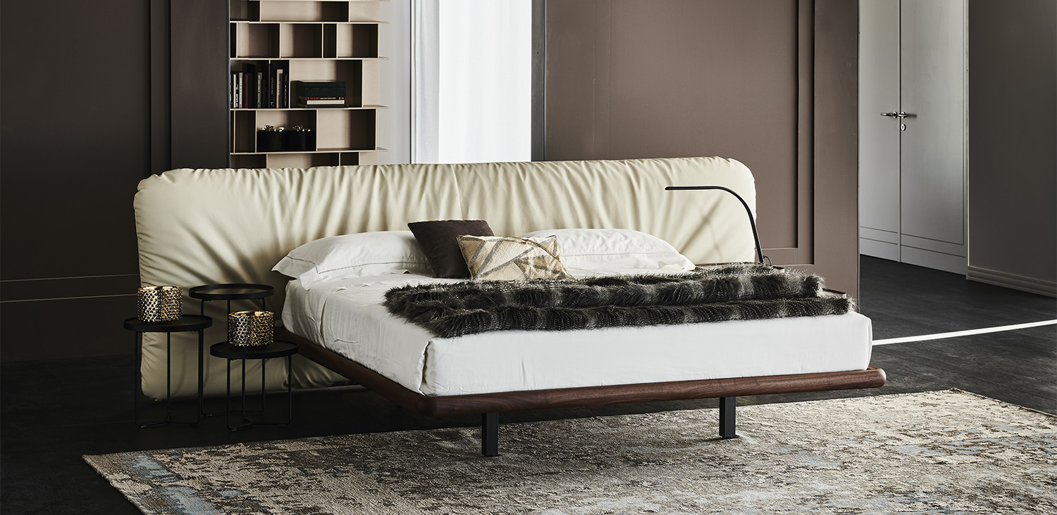 Bed with Canaletto walnut (NC) or burned oak stained ashwood (frRB) frame. Headboard covered in fabric, synthetic nubuck, micro nubuck, synthetic leather or soft leather as per sample card. Slats included. The cover is removable.