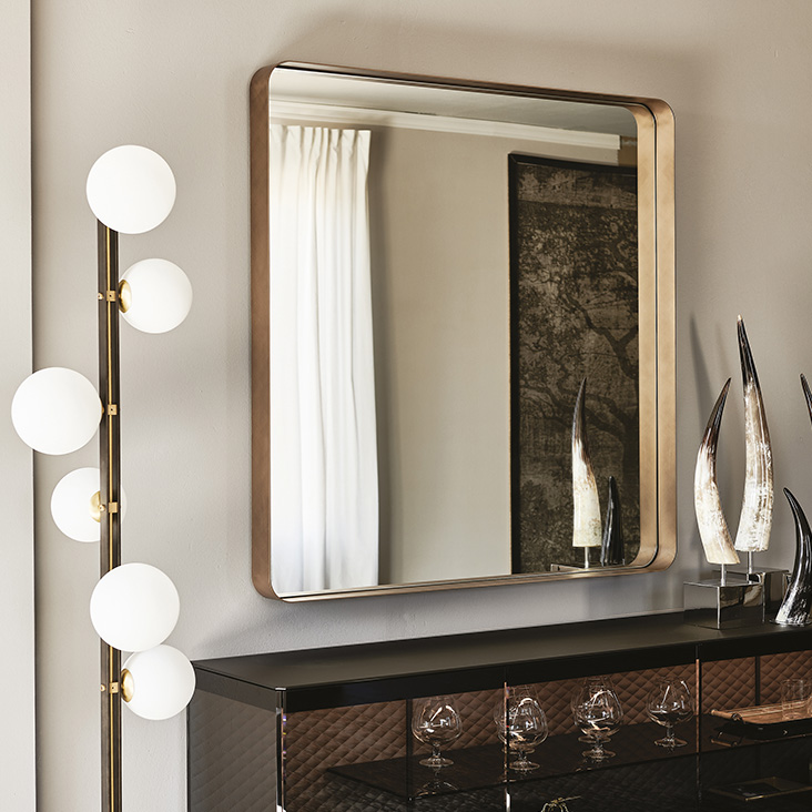 Wall mirror. Frame in titanium (GFM11) or black (GFM73) embossed lacquered steel or Brushed Bronze. Mirror is equipped with plates for both horizontal and vertical installation.