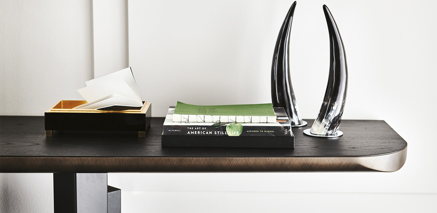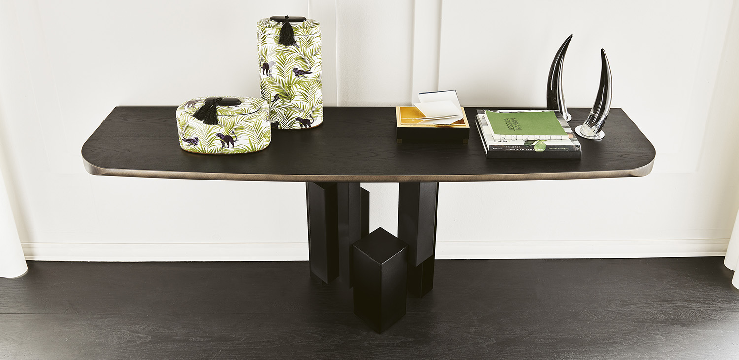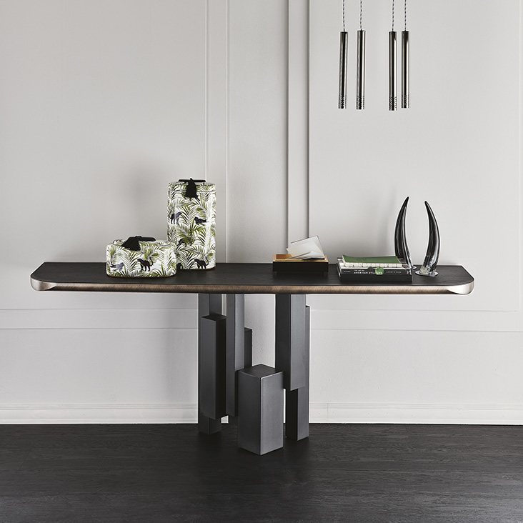 Console with base in titanium (GFM11), graphite (GFM69) or black (GFM73) embossed lacquered steel. Top in Canaletto walnut (NC) with Brushed Grey lacquered and rounded lower profile or elm open pore matt black (OLM73) with Brushed Bronze lacquered and rounded lower profile. Wall anchorage is necessary.