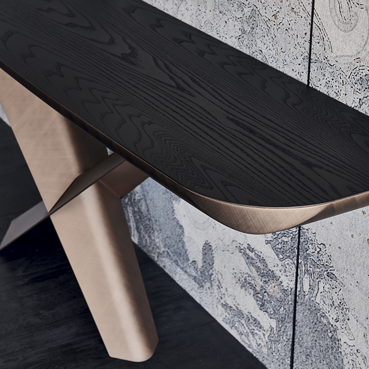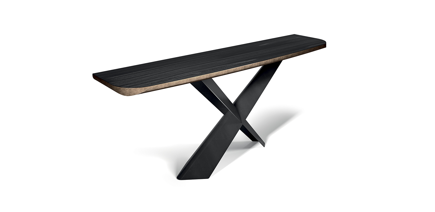 Console with base in titanium (GFM11), bronze (GFM18), graphite (GFM69) or black (GFM73) embossed lacquered steel, Brushed Bronze or Brushed Grey. Top in Canaletto walnut (NC) with Brushed Grey lacquered and rounded lower profile or elm open pore matt black (OLM73) with Brushed Bronze lacquered and rounded lower profile. Wall anchorage is necessary.