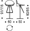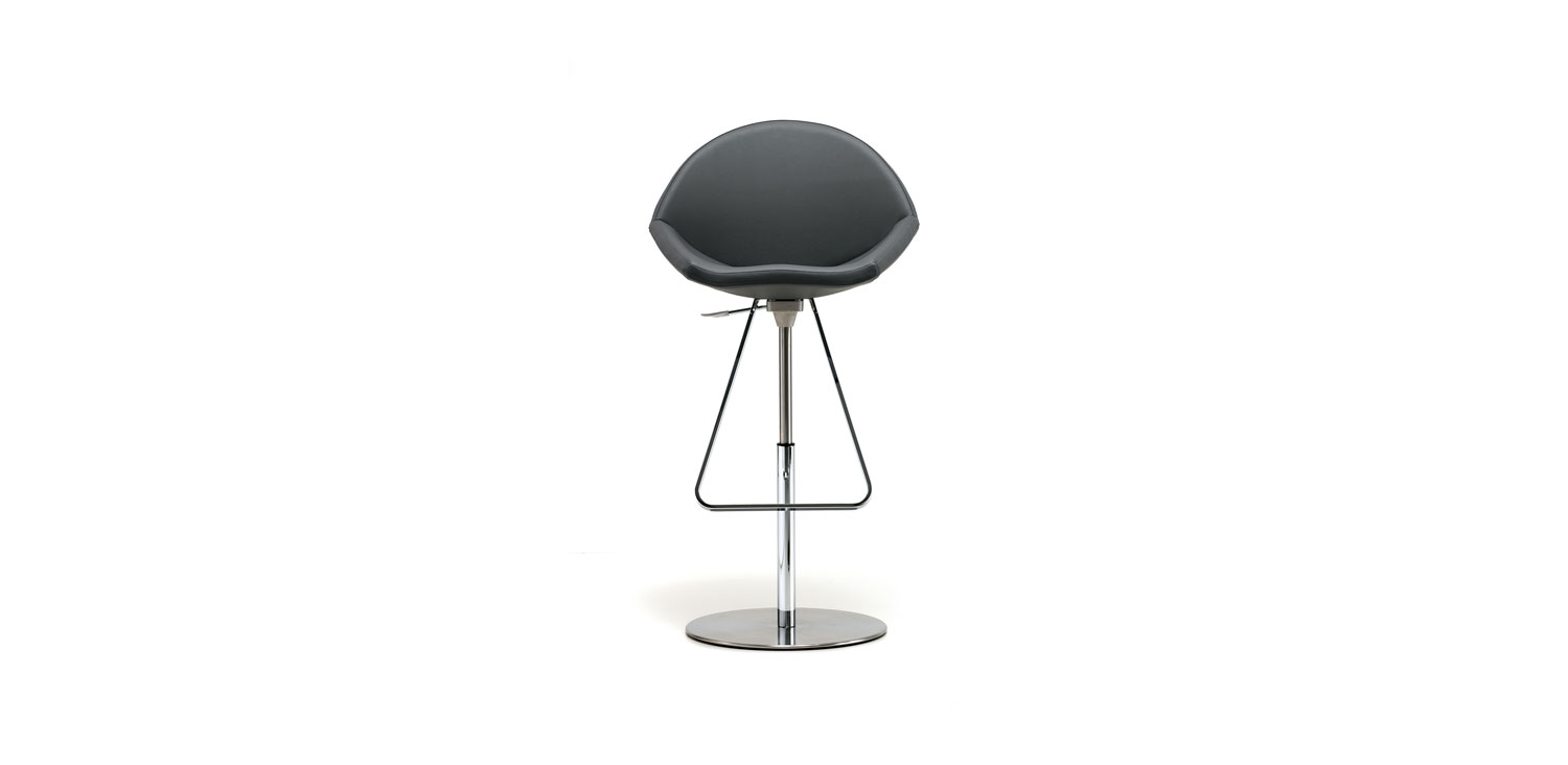 Swiveling stool, adjustable in height, with satin stainless steel base plate and column, footrest and gas piston in chromed steel (08) or with base plate, column, and footrest in black (GFM73) embossed lacquered steel and gas piston in chromed steel (08). Upholstered seat covered in fabric, synthetic nubuck, micro nubuck, soft leather or synthetic leather as per sample card. The soft leather, synthetic nubuck, micro nubuck and synthetic leather covers are not removable.