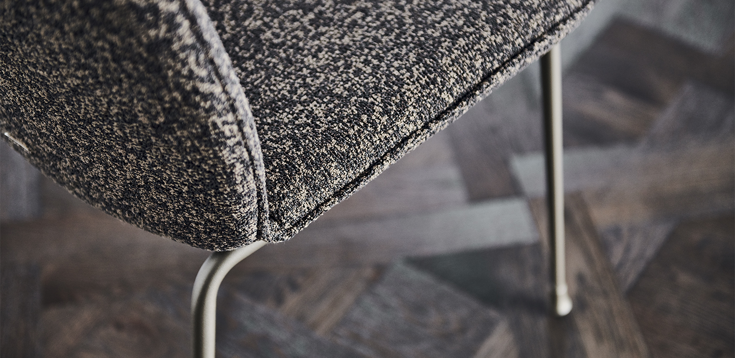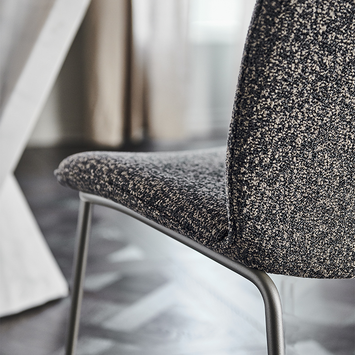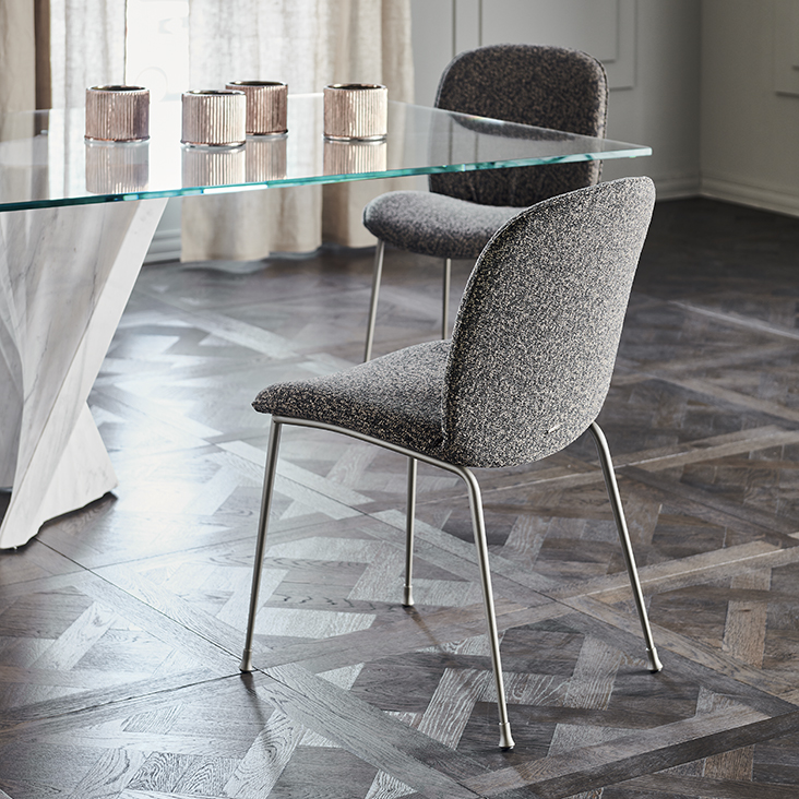 Chair with frame in titanium (GFM11), graphite (GFM69), white (GFM71) or black (GFM73) embossed lacquered steel. Cover in fabric, synthetic nubuck, micro nubuck, soft leather or synthetic leather as per sample card. The cover is not removable.