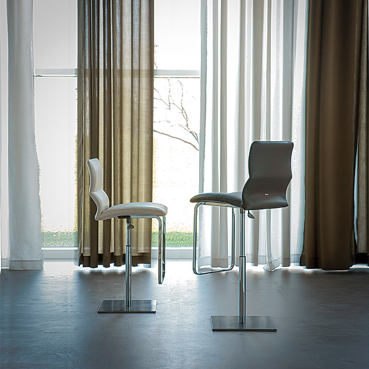 Swiveling stool, adjustable in height with satin stainless steel base plate and column, footrest and gas piston in chromed steel (08) or with base plate, column, and footrest in black (GFM73) embossed lacquered steel and gas piston in chromed steel (08). Seat covered in fabric, synthetic nubuck, micro nubuck, synthetic leather, or soft leather as per sample card. Round base on demand.