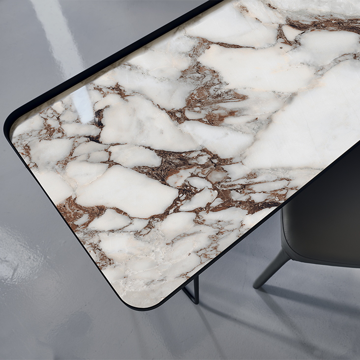 Desk with base and top frame in titanium (GFM11) or black (GFM73) embossed lacquered steel, or with base in black (GFM73) embossed lacquered steel and Brushed Bronze top frame. Top in ceramic Marmi Calacatta (KM01), Alabastro (KM02), Ardesia (KM04), matt Golden Calacatta (KM05), glossy Golden Calacatta (KM06), matt Portoro (KM07), glossy Portoro (KM08), glossy Sahara Noir (KM09), Emperador (KM10), Makalu (KM11), Breccia (KM12) or Arenal (KM13).