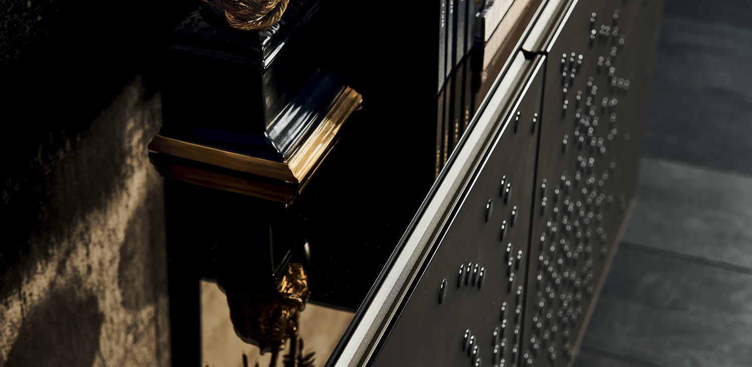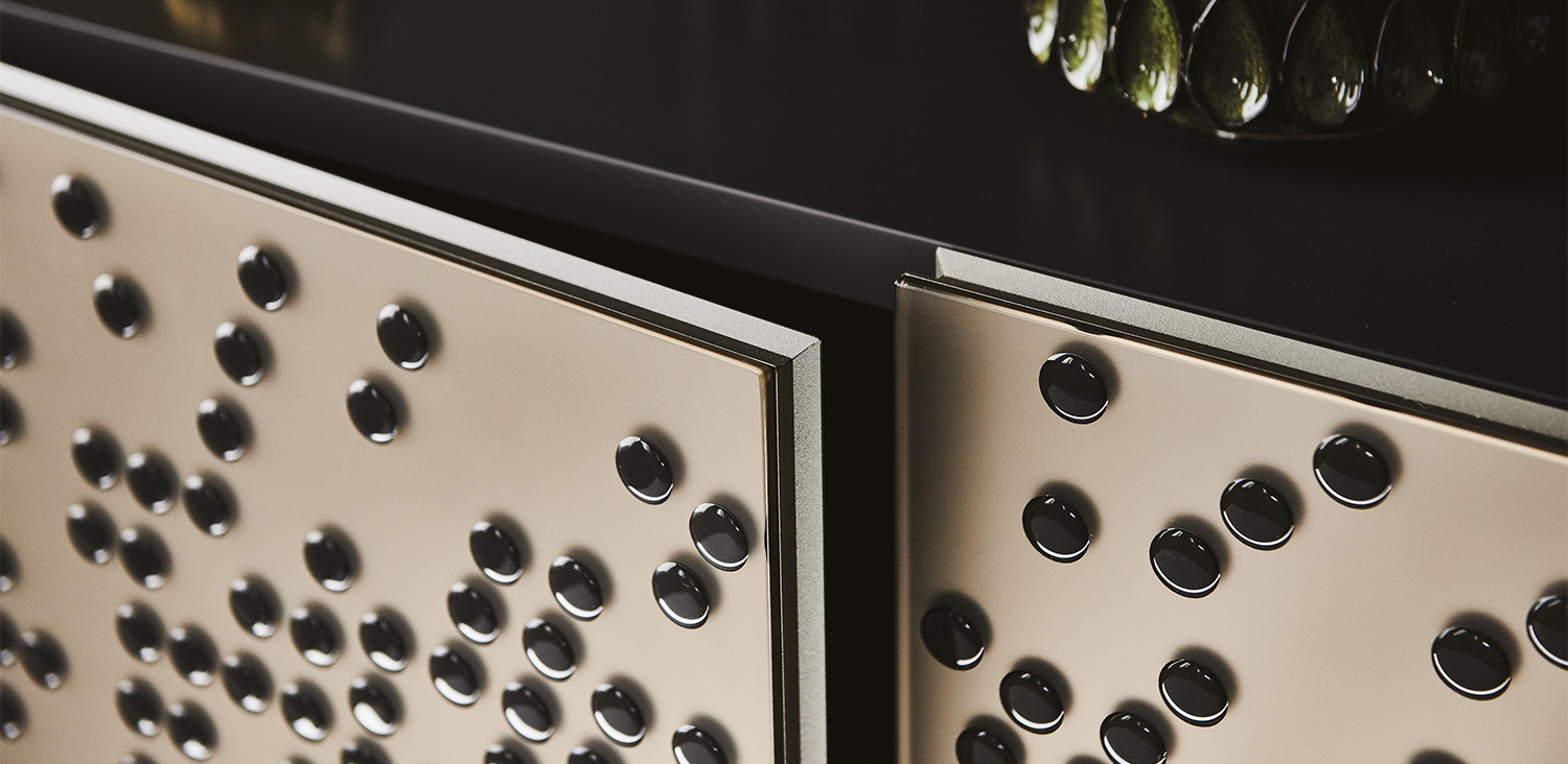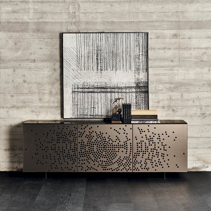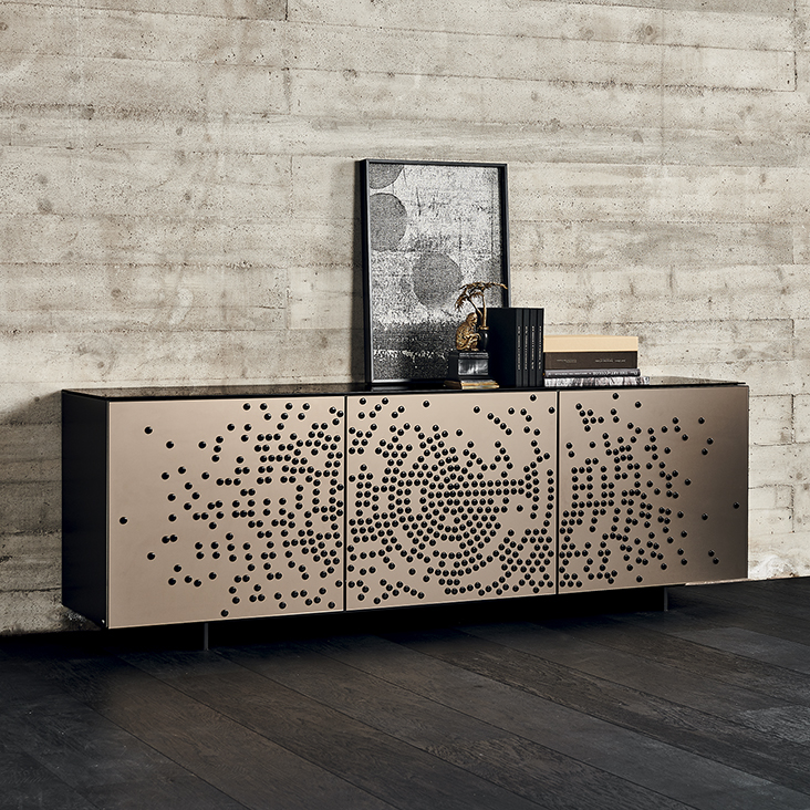 Sideboard 2 or 3 doors in polished lacquered wood glossy moka (L4), glossy white (L7), matt white (OP7), matt graphite (OP69) or titanium (M11). Doors in bronze mirrored frosted glass with relief glossy black decorations or in bronze mirrored glass with relief golden decorations. Embossed titanium (GFM11) aluminium profiles. Feet in polished stainless steel, matt white (OP71) or graphite (OP69) varnished. Internal shelves in clear glass. Optional: internal drawer in each door. Optional: top in extra clear mirrored frosted bronze glass or extra clear mirrored bronze glass.