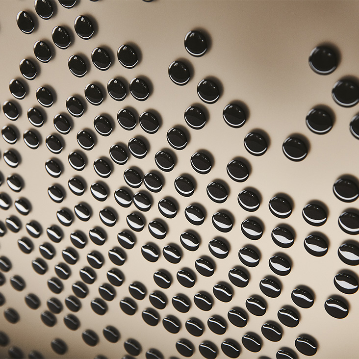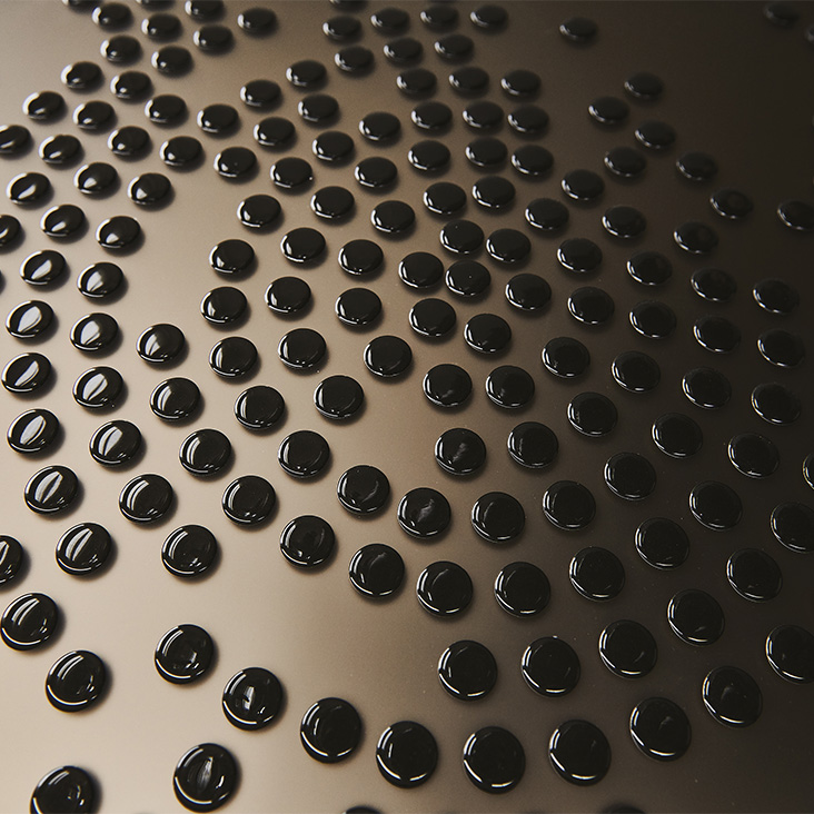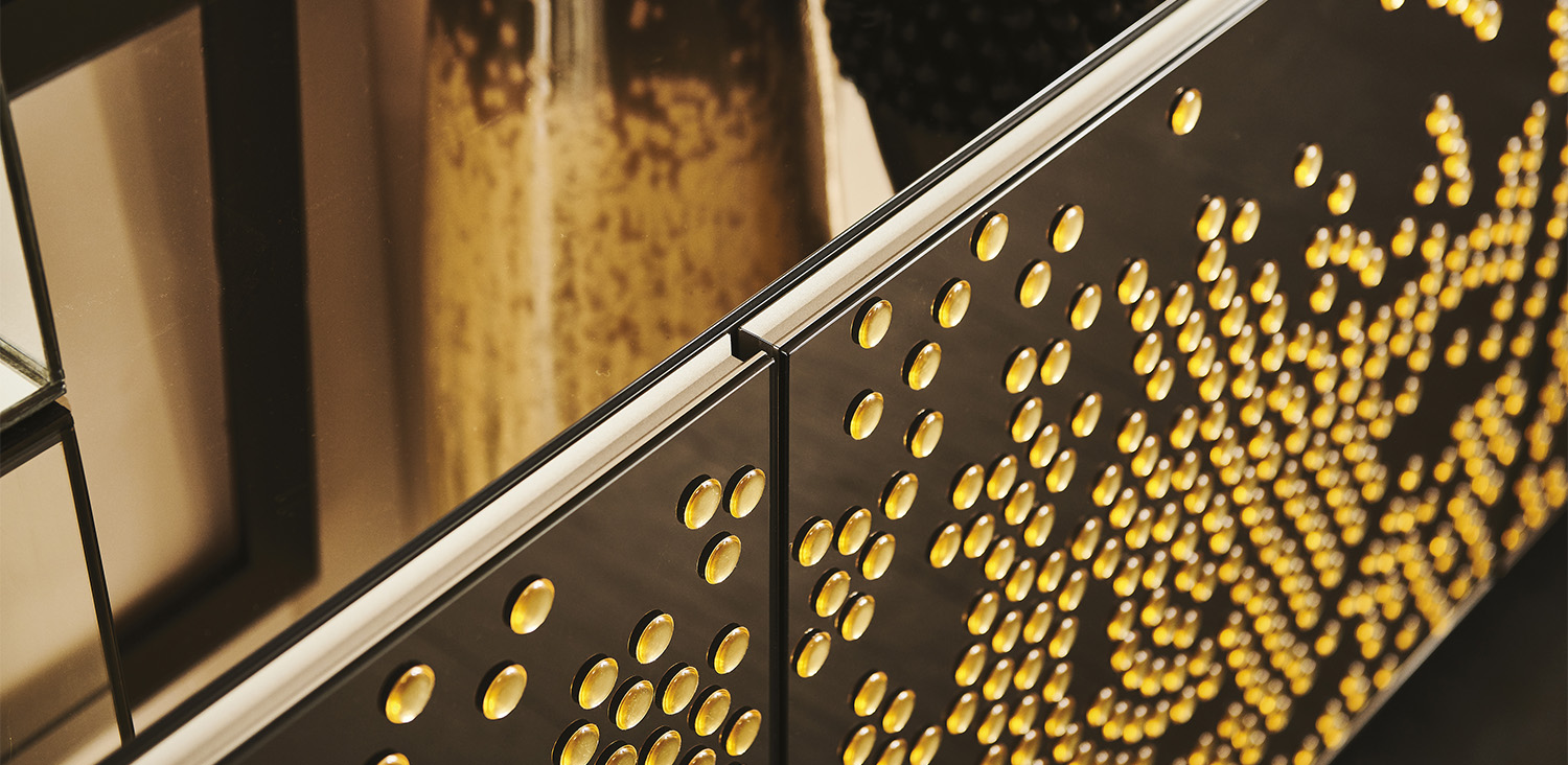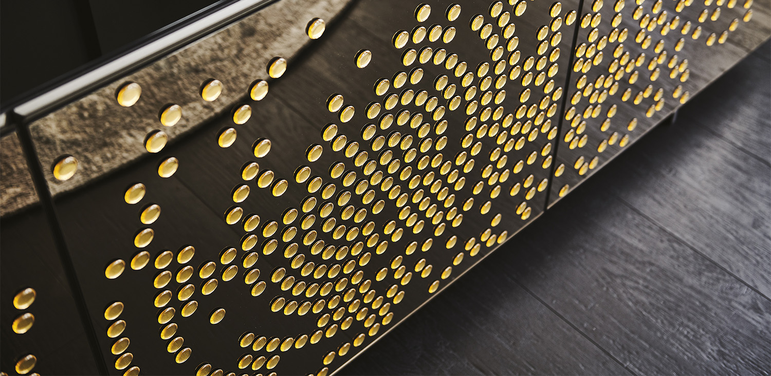 Sideboard 2 or 3 doors in polished lacquered wood glossy moka (L4), glossy white (L7), matt white (OP7), matt graphite (OP69) or titanium (M11). Doors in bronze mirrored frosted glass with relief glossy black decorations or in bronze mirrored glass with relief golden decorations. Embossed titanium (GFM11) aluminium profiles. Feet in polished stainless steel, matt white (OP71) or graphite (OP69) varnished. Internal shelves in clear glass. Optional: internal drawer in each door. Optional: top in extra clear mirrored frosted bronze glass or extra clear mirrored bronze glass.