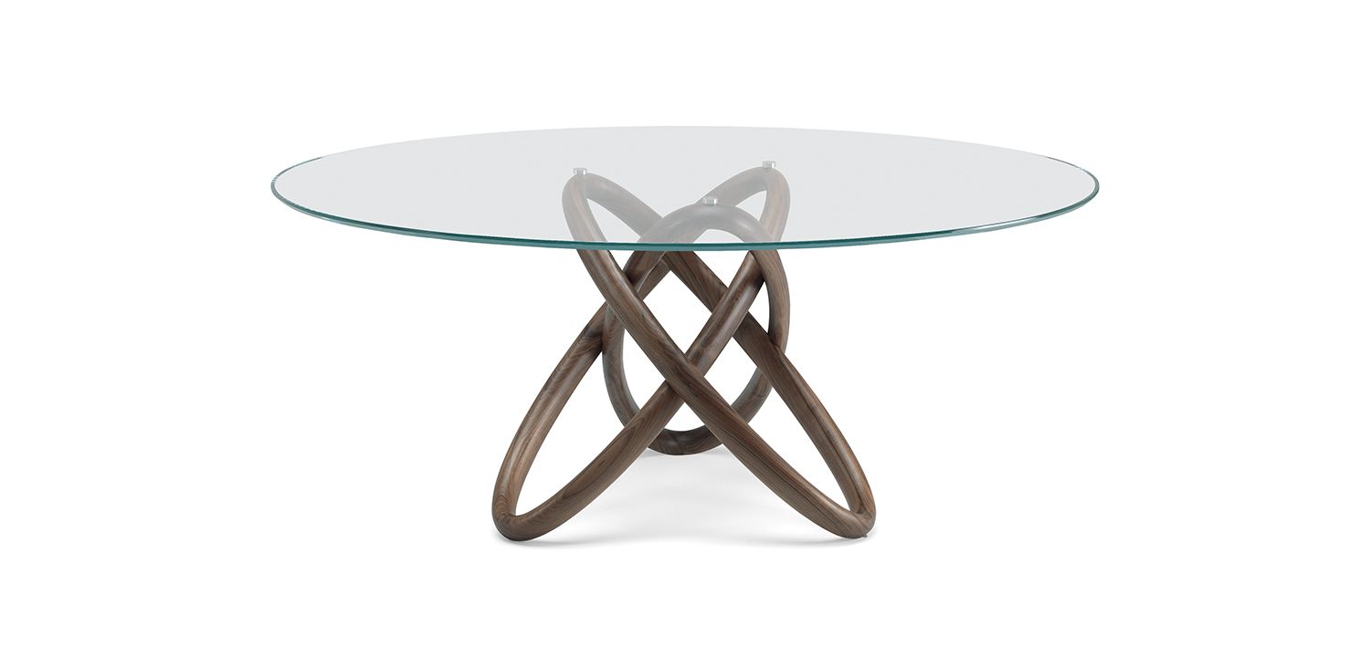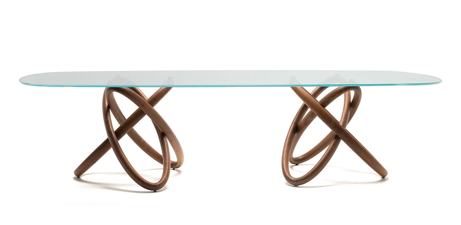 Table with base in solid Canaletto walnut wood (NC). Top with plates in 15mm clear glass or extra clear bevelled glass.