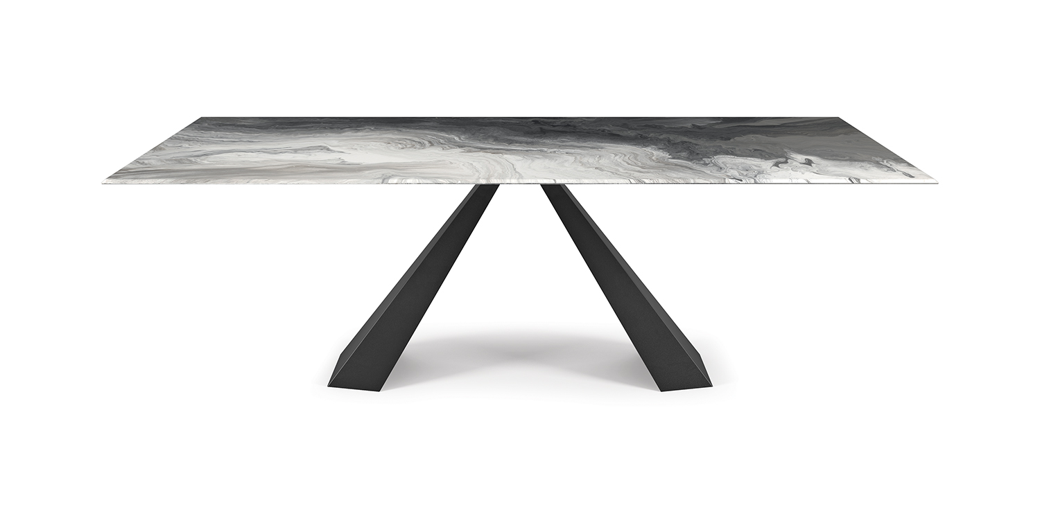 Table with base in titanium (GFM11), bronze (GFM18), graphite (GFM69), white (GFM71) or black (GFM73) embossed lacquered steel. Top 12mm thick in extra clear bevelled glass with artistic decorative printing in two different colours (CY01, CY02).