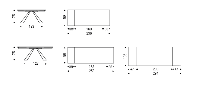 Extendible table with base in titanium (GFM11), bronze (GFM18), white (GFM71), graphite (GFM69) or black (GFM73) embossed lacquered steel. Top and extensions in 12mm extra clear glass with artistic decorative printing in two different colours (CY01, CY02).