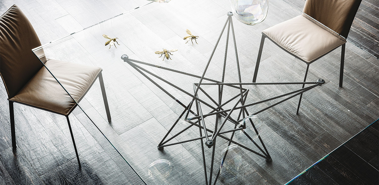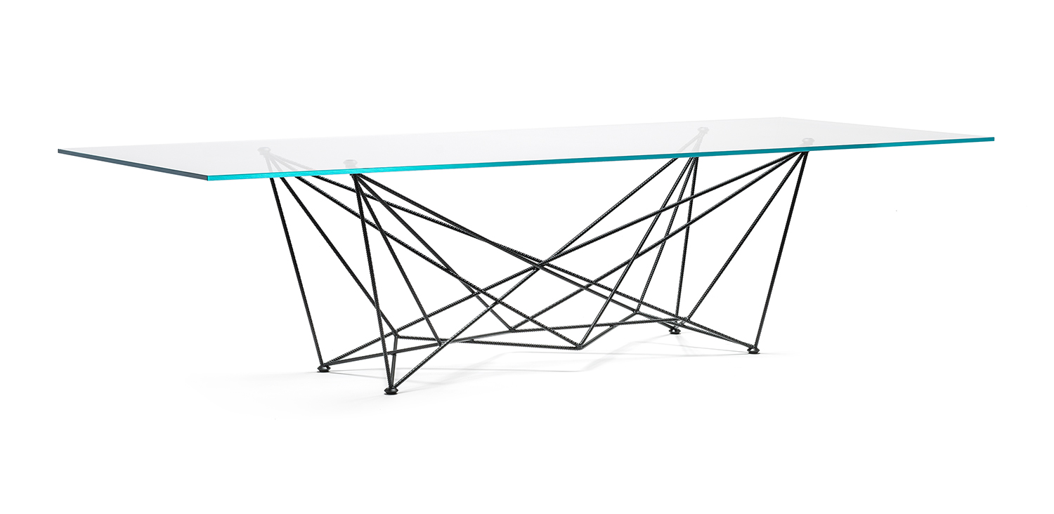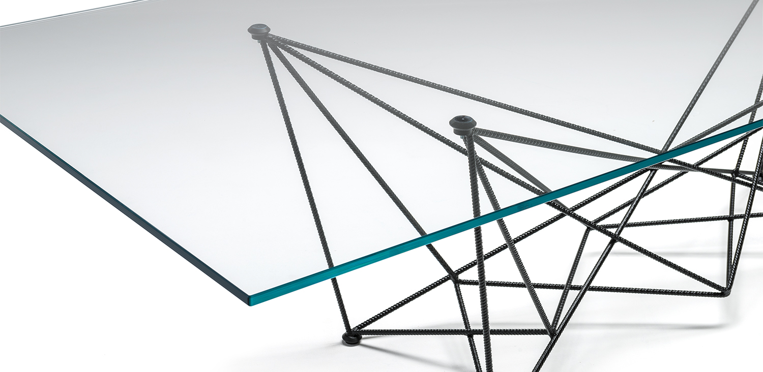 Table with titanium (GFM11), graphite (GFM69), white (GFM71) or black (GFM73) embossed lacquered steel base. Top in 15mm clear, extra clear or extra clear glass with reversed bevelled edges (rectangular version) or only bevelled (round version). Glass top 12mm on 182x90 and 200x106 versions. The top is laid on the base.