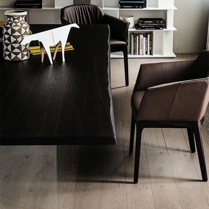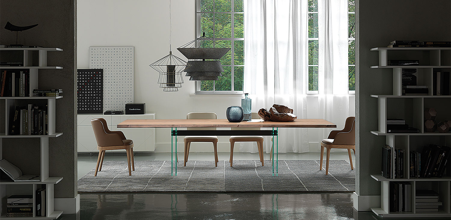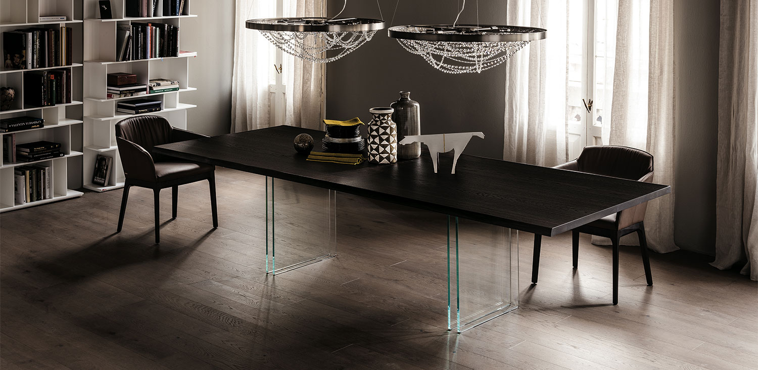 Table with 15mm extra clear tempered glass base and graphite (OP69) beam. Top in Canaletto walnut (NC), burned oak (RB) or natural oak (RN) with irregular solid wood edges. Available also with Canaletto walnut (NC), burned oak (RB) or natural oak (RN) beam.