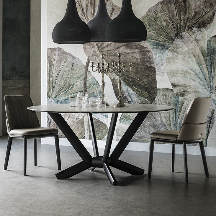 Table with base in titanium (GFM11), bronze (GFM18), graphite (GFM69) or black (GFM73) embossed lacquered steel, Brushed Bronze or Brushed Grey. Top in ceramic Marmi Calacatta (KM01), Alabastro (KM02), Ardesia (KM04), matt Golden Calacatta (KM05), glossy Golden Calacatta (KM06), matt Portoro (KM07), glossy Portoro (KM08), glossy Sahara Noir (KM09), Emperador (KM10), Makalu (KM11), Breccia (KM12) or Arenal (KM13).