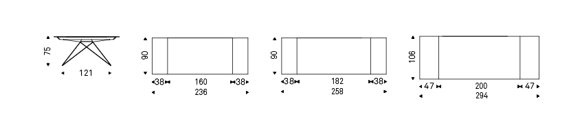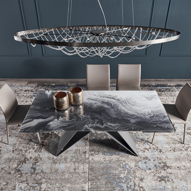 Extendible table with base in titanium (GFM11), bronze (GFM18), graphite (GFM69), black (GFM73) embossed lacquered steel. Top and extensions in 12mm extra clear glass with artistic decorative printing in two different colours (CY01, CY02).