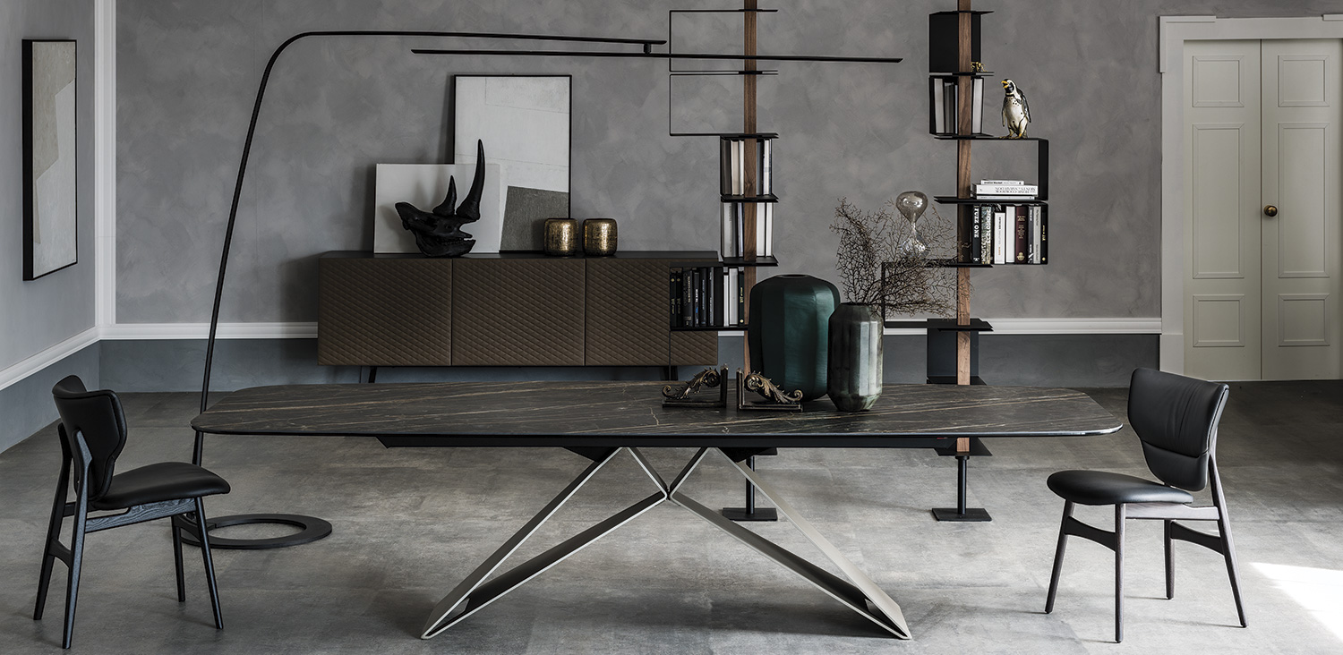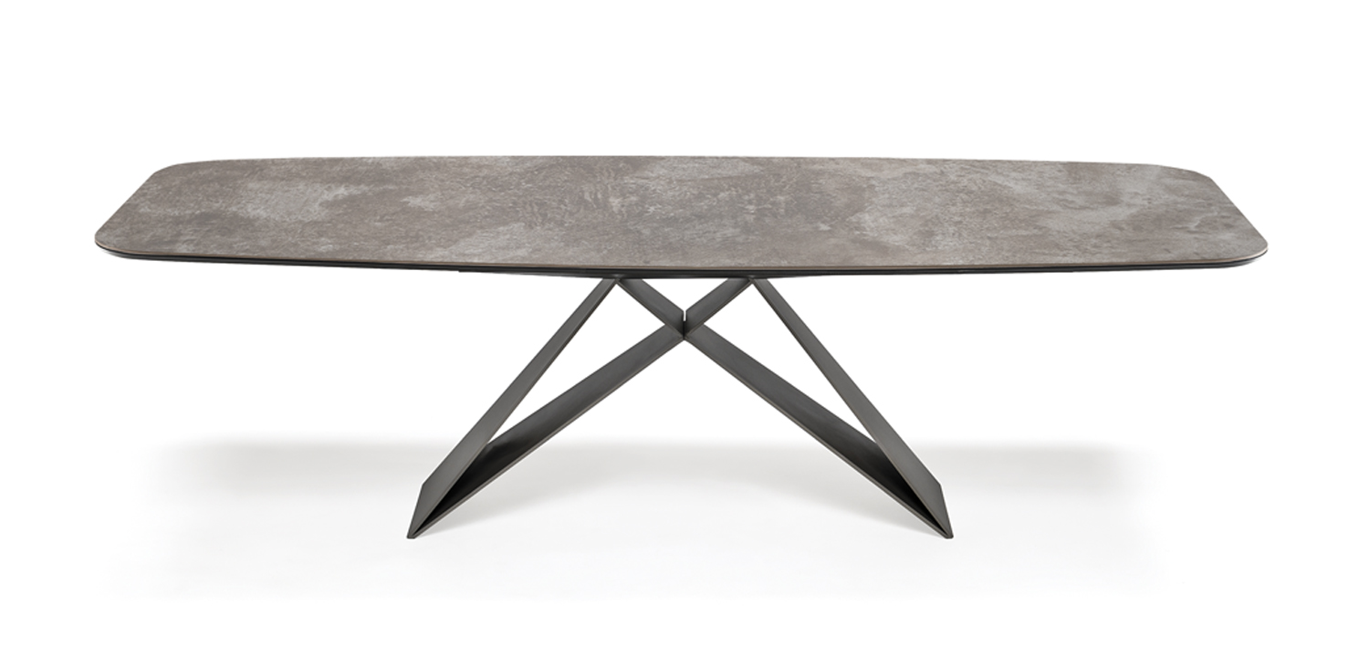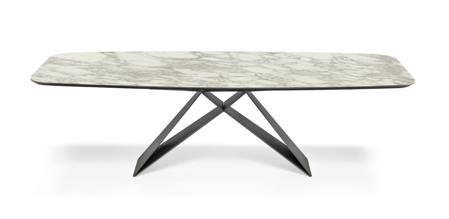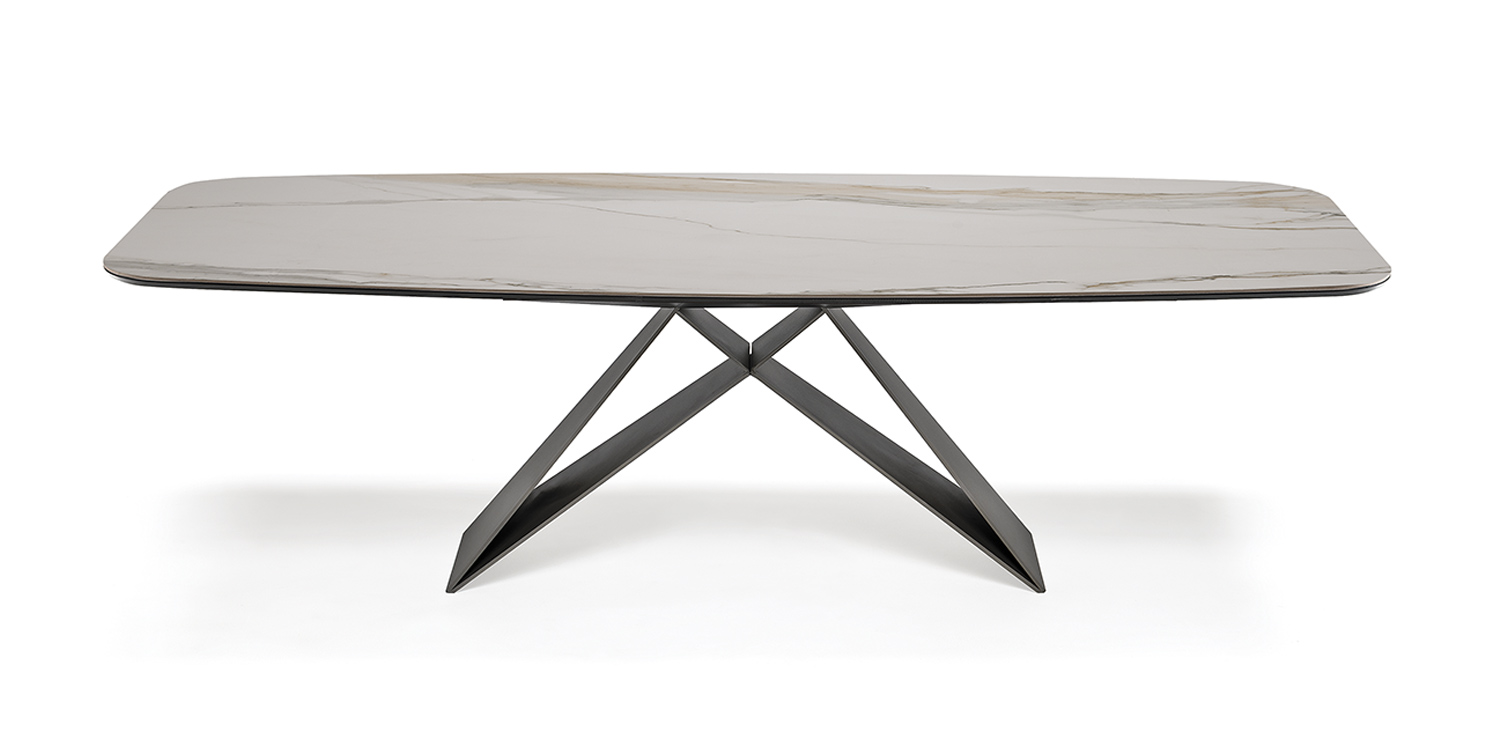 Table with base in titanium (GFM11), bronze (GFM18), graphite (GFM69) or black (GFM73) embossed lacquered steel. Marmi Calacatta (KM01), Alabastro (KM02), Ardesia (KM04), matt Golden Calacatta (KM05), glossy Golden Calacatta (KM06), matt Portoro (KM07), glossy Portoro (KM08), glossy Sahara Noir (KM09), Emperador (KM10), Makalu (KM11), Breccia (KM12) or Arenal (KM13) ceramic top.