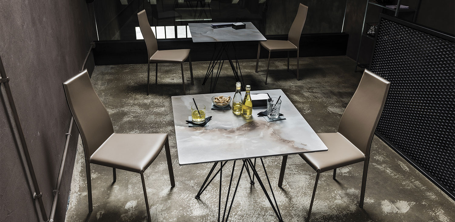 Bistrot table with graphite (GFM69), white (GFM71) or black (GFM73) embossed lacquered steel base. Marmi Calacatta (KM01), Alabastro (KM02), Ardesia (KM04), Emperador (KM10), Makalu (KM11) or Arenal (KM13) ceramic top.
