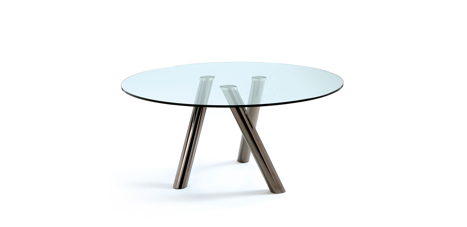 Table with base in chromed steel (08), black chrome (06), painted matt white (OP71), matt graphite (OP69) or covered in leather as per sample card. Top in 15mm tempered clear glass.