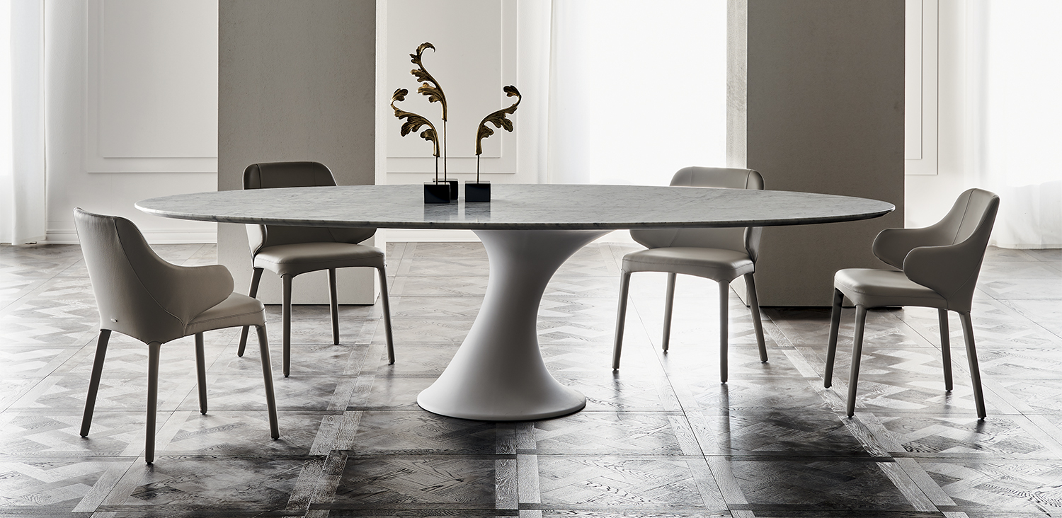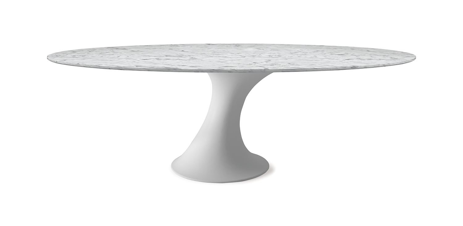 Table with matt white cristalplant base. Top in matt white Carrara (BCO) marble. Optional central swiveling tray Lazy Susan.