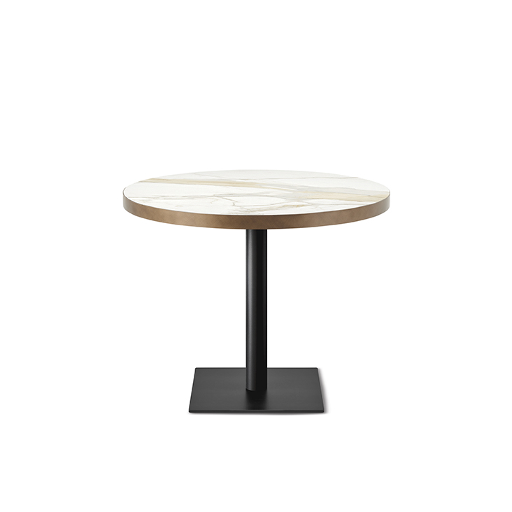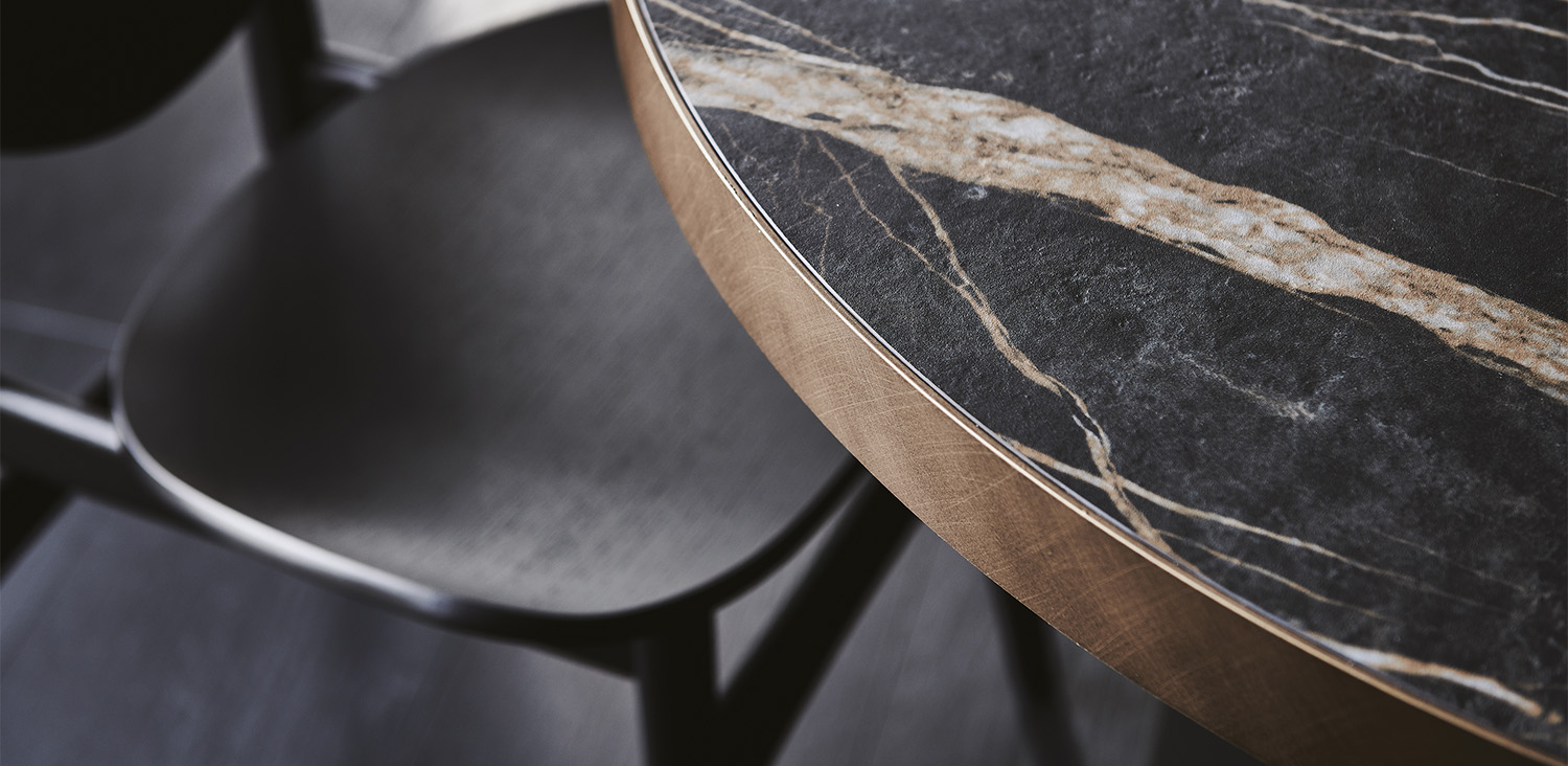 Bistrot table with base in titanium (GFM11), graphite (GFM69) or black (GFM73) embossed lacquered steel and top frame in titanium (GFM11), graphite (GFM69) or black (GFM73) embossed lacquered steel or Brushed Bronze. Marmi Calacatta (KM01), Alabastro (KM02), Ardesia (KM04), matt Portoro (KM07), glossy Portoro (KM08), Emperador (KM10), Makalu (KM11) or Arenal (KM13) ceramic top.