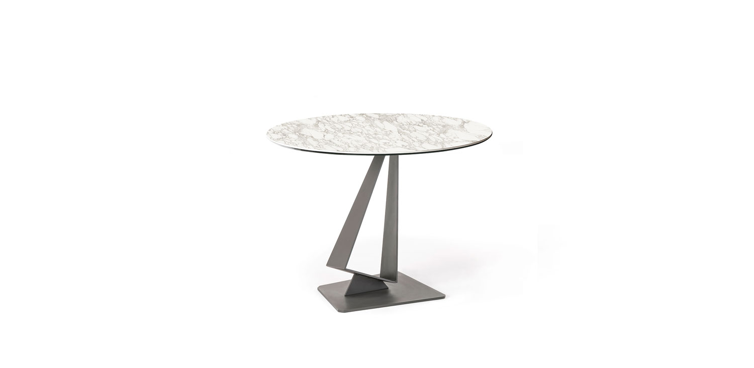Table with base in graphite (GFM69) or white (GFM71) embossed lacquered steel. Top in Marmi ceramic in Calacatta (KM01), Alabastro (KM02), Ardesia (KM04), Emperador (KM10), Makalu (KM11) or Arenal (KM13).