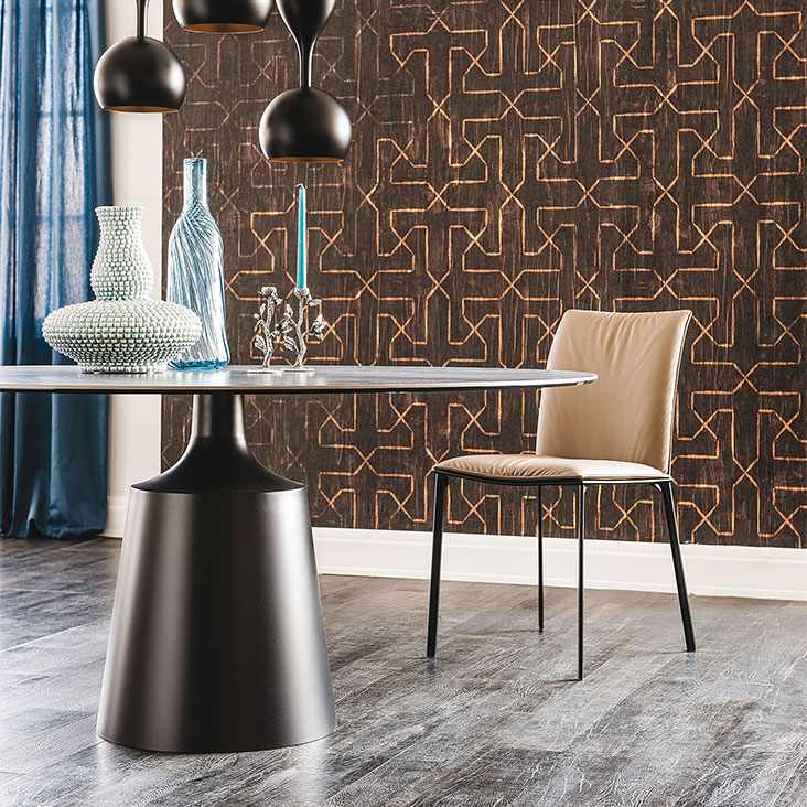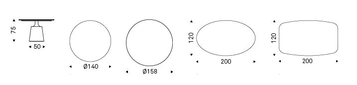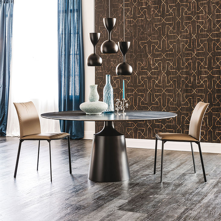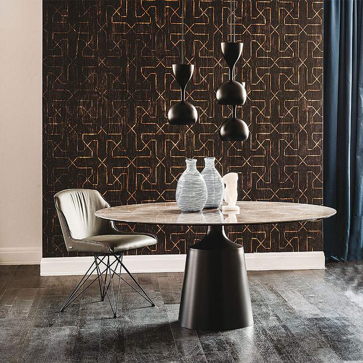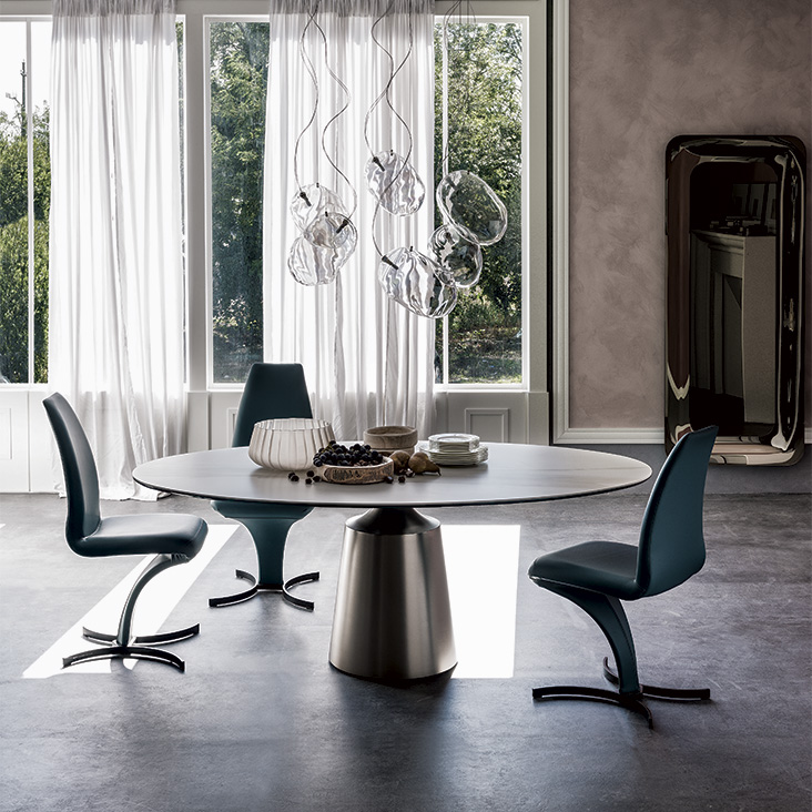 Table with base in graphite (GFM69), white (GFM71), black (GFM73) embossed lacquered steel or satin titanium steel (11). Marmi Calacatta (KM01), Alabastro (KM02), Ardesia (KM04), matt Golden Calacatta (KM05), glossy Golden Calacatta (KM06), matt Portoro (KM07), glossy Portoro (KM08), glossy Sahara Noir (KM09), Emperador (KM10), Makalu (KM11), Breccia (KM12) or Arenal (KM13) ceramic top. Glazes on the satin titanium base are due to the handmade work. Optional central swiveling tray Lazy Susan.