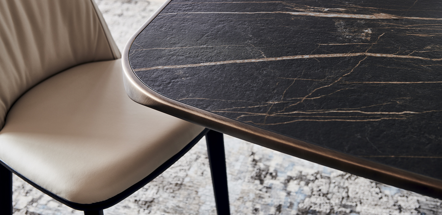 Table with base in graphite (GFM69), white (GFM71), black (GFM73) embossed lacquered steel or satin titanium steel (11). Top in ceramic Marmi Calacatta (KM01), Alabastro (KM02), Ardesia (KM04), matt Golden Calacatta (KM05), glossy Golden Calacatta (KM06), matt Portoro (KM07), glossy Portoro (KM08), glossy Sahara Noir (KM09), Emperador (KM10), Makalu (KM11), Breccia (KM12) or Arenal (KM13) with Brushed Bronze or Brushed Grey lacquered and rounded lower profile.